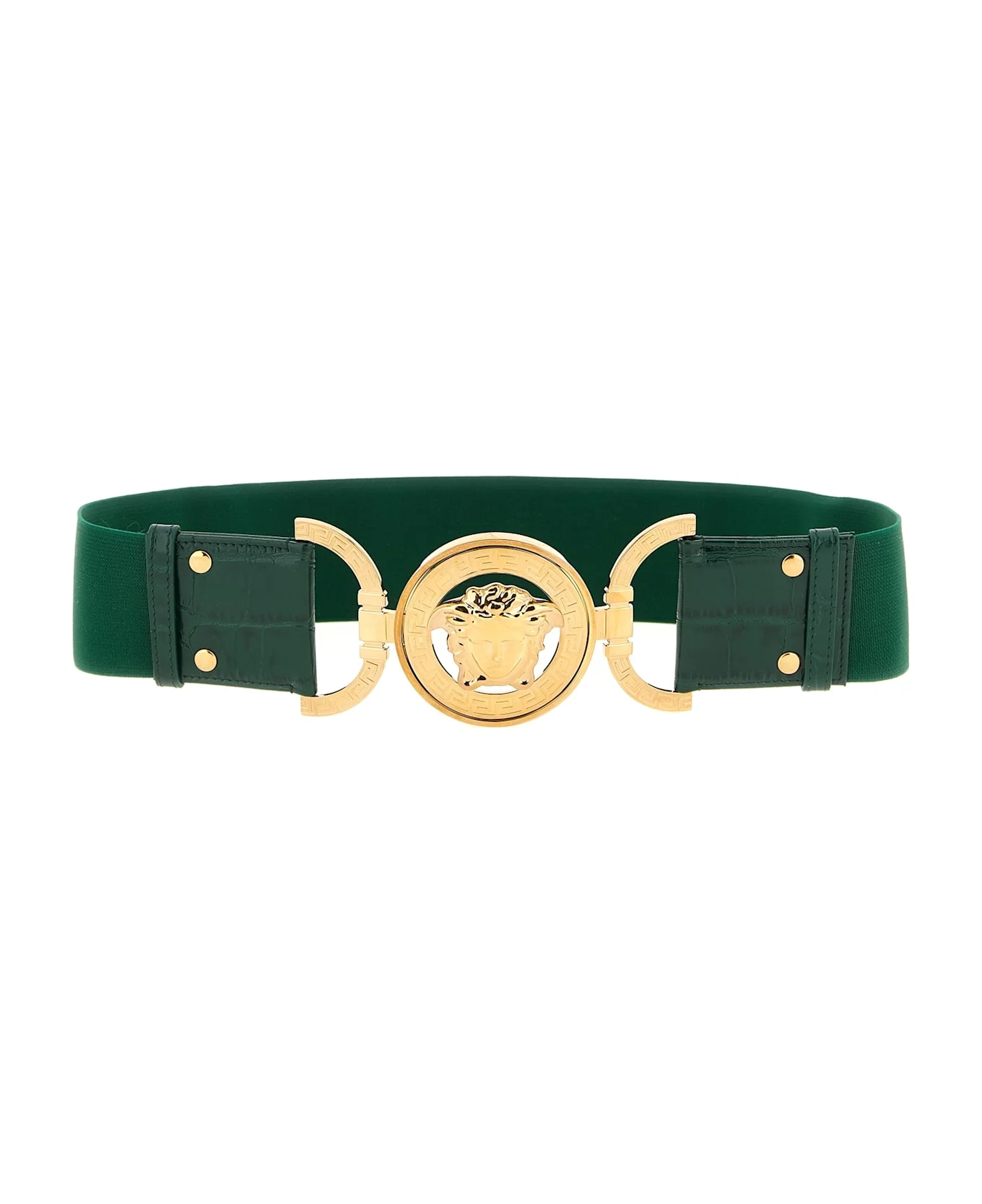 Elastic belt with tone-on-tone coconut-effect calf leather details and 'Medusa '95' snap metal buckle. Composition: 100% calfskin leather (Bos Taurus) Made in: Italy Color: Green Size and fit: - H 6 cm Model number: 10165331A170561GJ1V