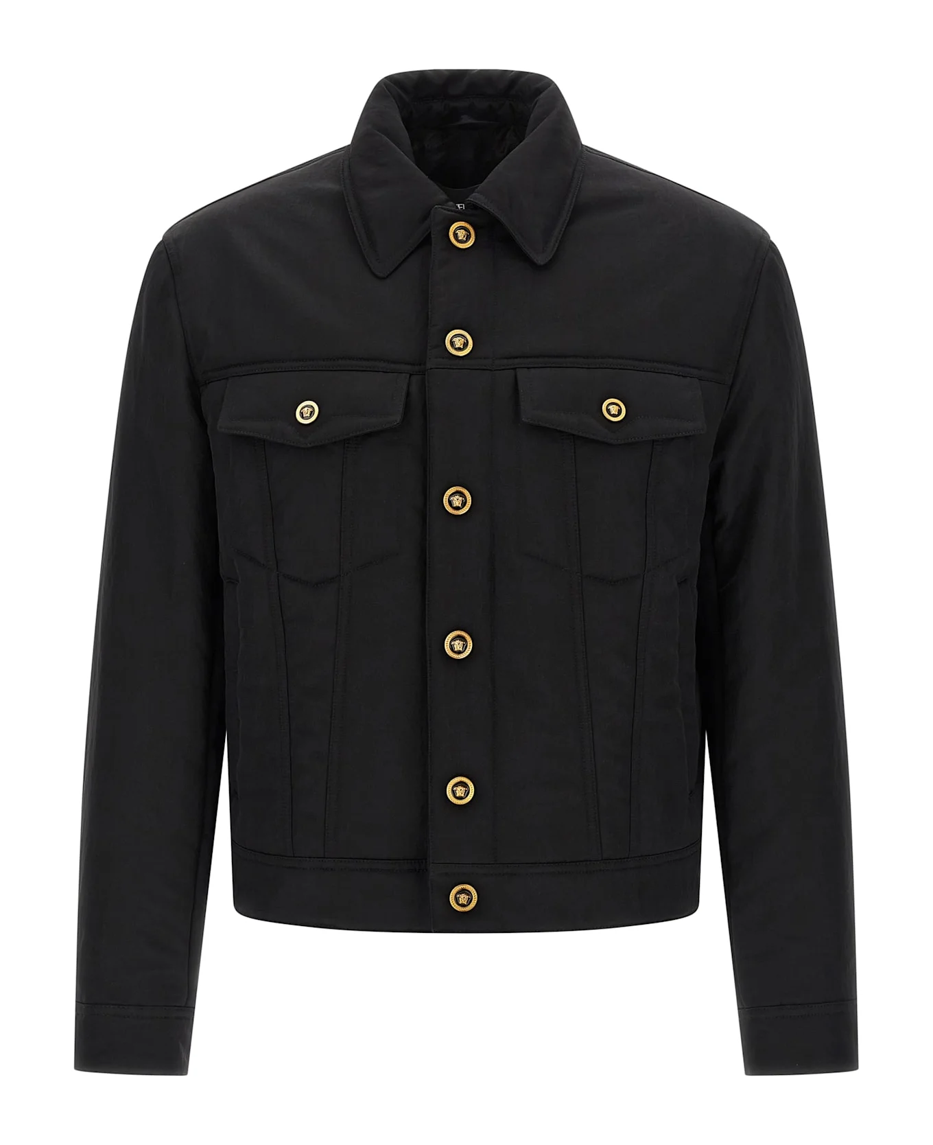 Lightly padded nylon jacket, shirt collar, front metal 'Medusa' button closure, pockets, long cuffed sleeves, cupro lining. Composition: 100% nylon Made in: Romania Color: Black Size and fit: - true to size fit Model number: 10222401A164501B000