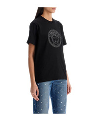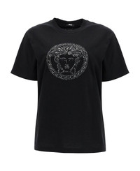 This Versace t-shirt is made of pure cotton and features a straight, relaxed fit. It is characterized by the iconic Medusa motif embroidered on the front with lurex and rhinestones. The crew neck is finished with ribbing. The model is 177 cm tall and wears an IT size 38. Composition: 100% CO Made in: Italy Color: Nero Model number: 10187521A13594