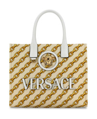 100% cotton Made in: Italy Color: PORCELAINWHITEMULTICOLORVERSACEGOLD Size and fit: - Width: 29,5 cm Height: 24 cm Depth: 14,5 cm Handle height: 13 cm Min shoulder strap length: 37,5 cm Max shoulder strap length: 57,5 cm Model number: 10058611A135685W73V