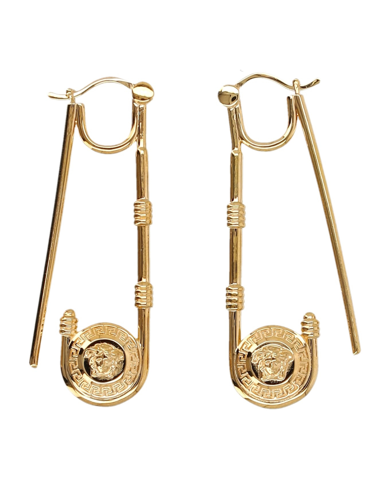 Safety Pin Earrings By Versace. Featuring: Safety Pin Drop Earrings Hinge Closure Medusa Medallions With Greca Engraving Lead And Nickel-free Length: 5 Cm Composition: 100% metal Made in: Italy Color: VERSACE GOLD Size and fit: - Length: 5 cm Model number: 10205661A006203J000