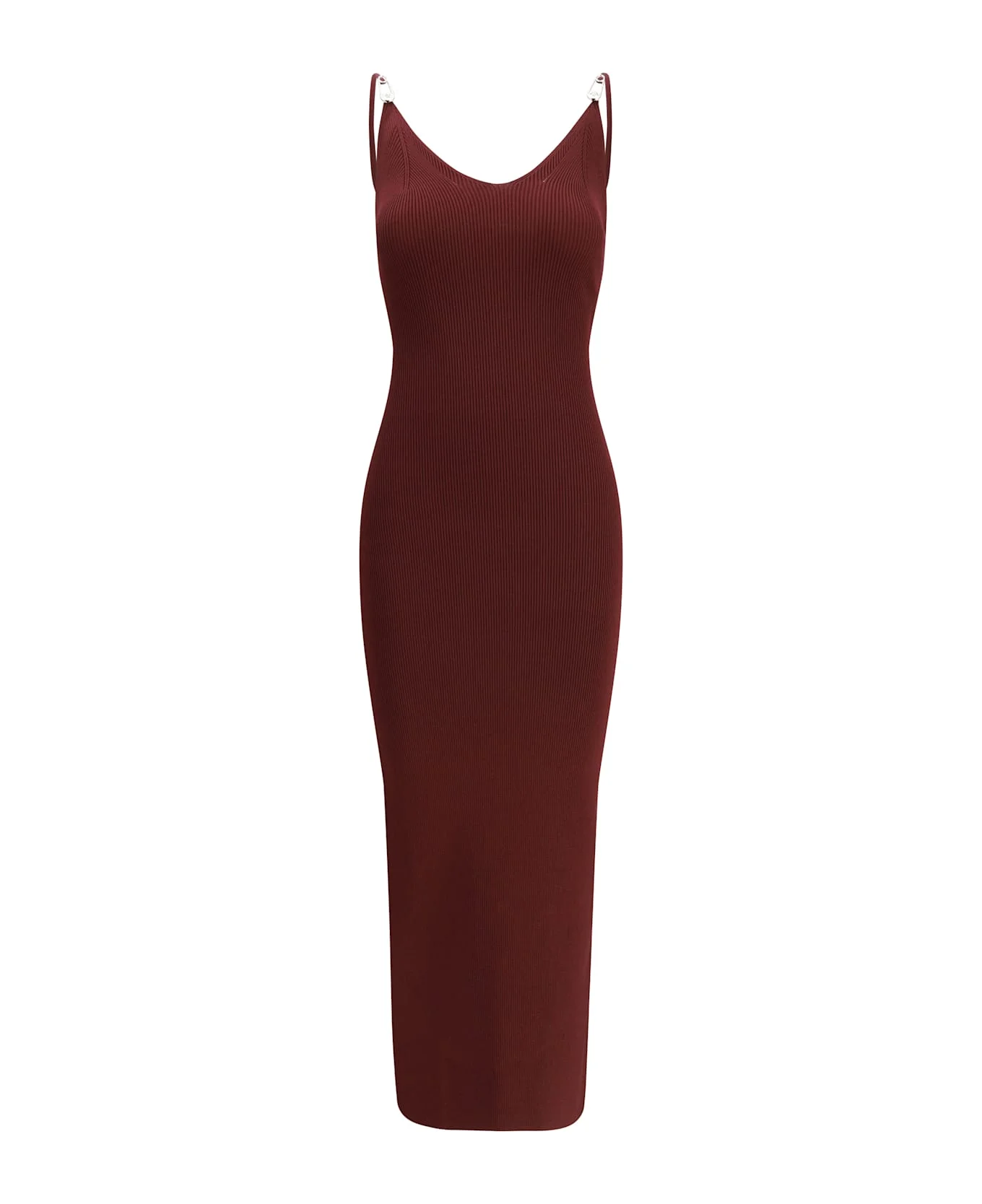 The safety pin slip midi dress by versace features a fitted line crafted from stretch viscose knit, offering a controlled, body-skimming elasticity. the v-neckline is cleanly defined, while the ribbed texture adds structure and maintains a streamlined appearance. the safety pin detail and the medusa head motif introduce the house s signature elements with subtle precision. a rear slit allows ease of movement, completing a silhouette designed for modern, effortless elegance. Composition: 83% % Viscose, 17% % Polyester Made in: Italy Model number: 10185861A126991RD90