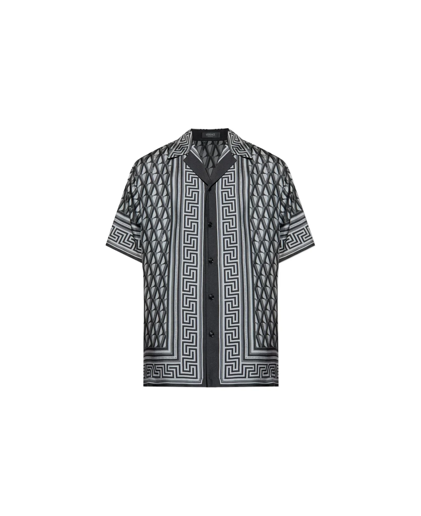 grey/black monogram pattern signature Grecca trim button fastening short sleeves camp collar silk Made in: Italy Color: GREY/BLACK Model number: 1A167851022740