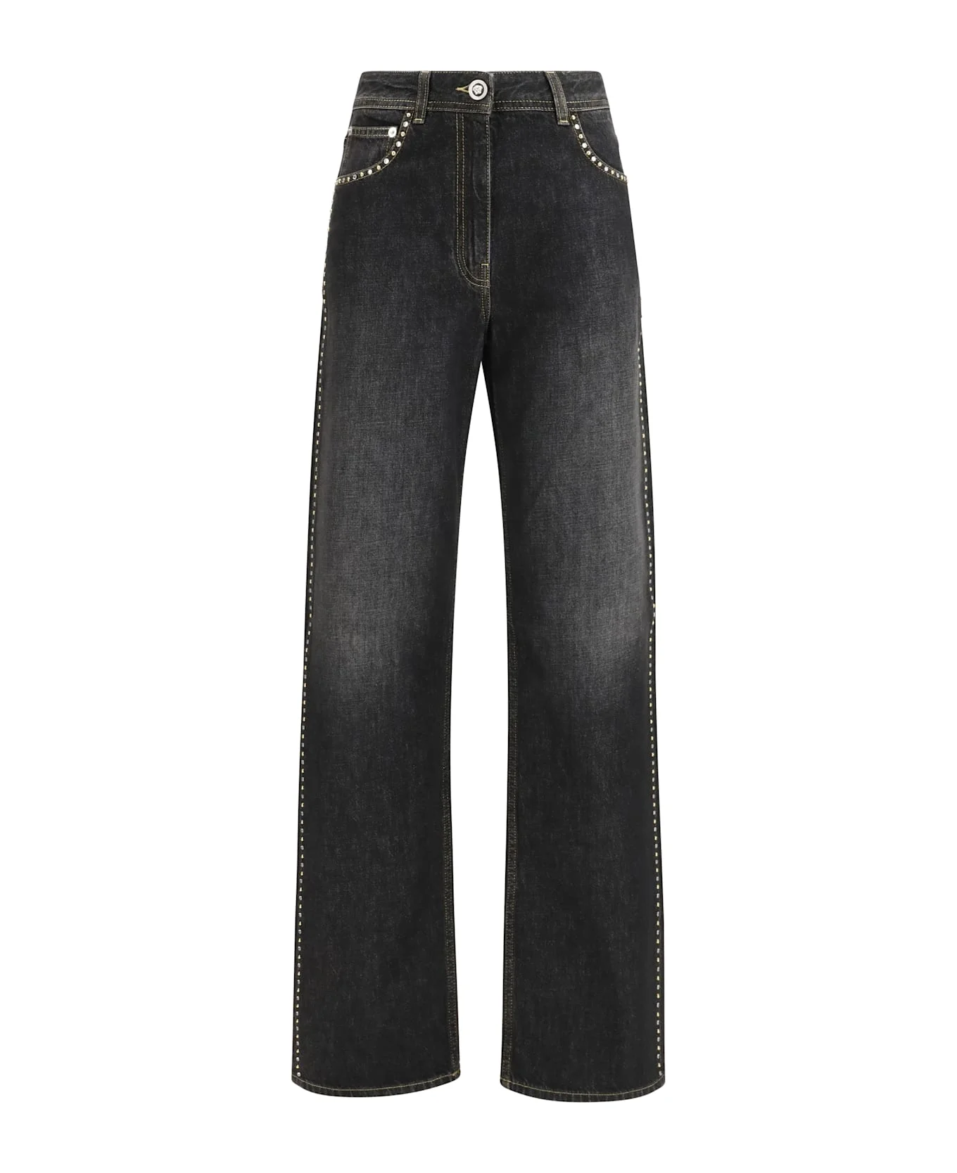 The straight jeans by versace with studs combine classic denim with iconic brand details, such as the medusa button and leather logo applique. decorated with studs and crystals, they offer a rock-chic touch. the five-pocket style and button and zip closure complete the practical and stylish design. perfect for a bold and sophisticated look. Composition: 100% % Cotton Made in: Italy Model number: 10224521A164771D040