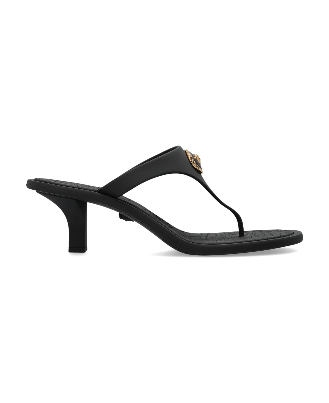 Experience refined elegance with these Versace heeled mules, expertly crafted in a sleek black silhouette. Impeccably minimalist, these sandals feature a modest, stable heel that elevates both comfort and sophistication. The high-quality synthetic construction lends a contemporary luster, while the interior boasts an artfully embossed floral motif and the iconic Versace signature. Accentuating the design is a bold, gold Medusa head medallion a distinctive emblem of the Versace house adorned at the center strap. The subtle, profiled sole with its delicate floral detail harmonizes modern luxury with exquisite Italian craftsmanship, making this pair a symbol of enduring allure. Why choose this product? Exclusive Versace gold Medusa hardware Sleek, minimalist form for versatile elegance Premium synthetic materials with refined detailing Comfortable, sculpted heel for graceful wear Signature Italian artistry and heritage Composition: Inner Layer: Rubber Outer Layer: Rubber Sole: Rubber Made in: Italy Color: BLACK/GOLD Size and fit: - Sole height: 1cm - Sole height at the highest point: 7cm Model number: 1A109831020961