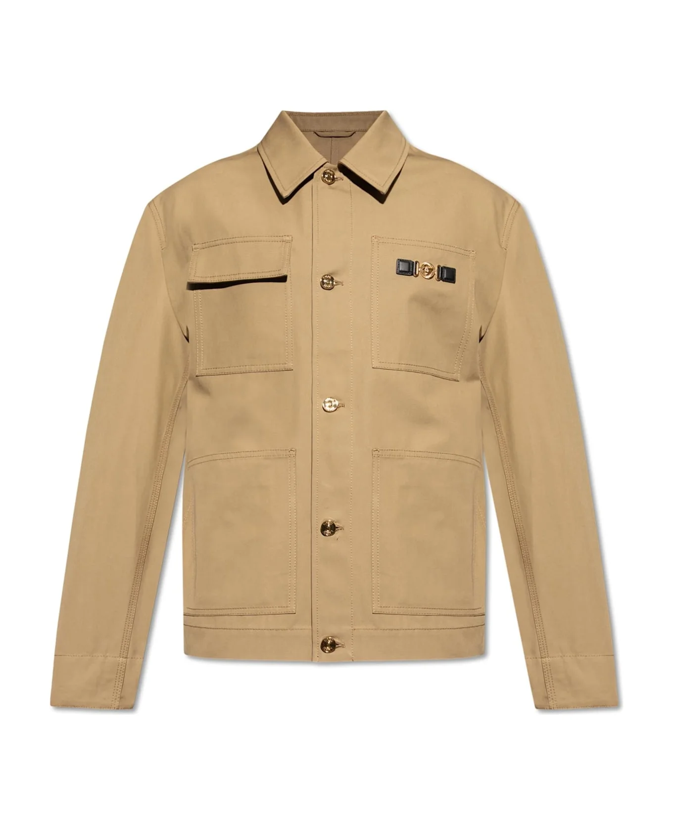 Discover understated luxury with this Versace Beige Application Jacket, a testament to refined casual sophistication. Crafted from a robust, high-quality cotton fabric, this jacket offers a classic, subtly boxy silhouette, complemented by a distinguished shirt-style collar and impeccably tailored lines. The regular hip-length cut and precise shoulder construction evoke timeless masculine elegance, while the uniform beige colorway and prominent stitched details highlight consummate attention to craftsmanship. Functional artistry is expressed through two front patch pockets and dual chest pockets one accented with striking black piping and horizontal stitching, seamlessly fusing practicality with Versace's iconic flair. The distinctive designer application signifies the legacy of a house famed for harmonizing Italian tradition and modern dynamism. Why choose this product? Expertly tailored for a refined, contemporary silhouette Luxurious, durable cotton fabric ensures lasting comfort Signature Versace application exudes exclusivity and heritage Thoughtfully constructed pockets blend style and utility An iconic piece that elevates any discerning wardrobe Composition: 100% Cotton 100% Cotton 100% Cotton Made in: Italy Color: Dark sand Model number: 10206871A150011KI10