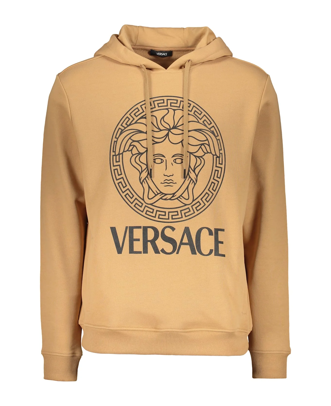 Hooded sweatshirt with a modern and sporty design, made in a warm caramel color. it features a large versace logo on the front, complemented by an iconic illustration. the fit is comfortable and easy to match, perfect for creating casual and trendy looks. the long sleeves and hood add a functional touch, making it ideal for cool days. this sweatshirt is a must-have for those who wish to combine style and comfort. 94% cotton, 6% elastane, 100% cotton Composition: 94% % Cotton, 6% % Elastane, 100% % Cotton Made in: Turkey Color: Camel Model number: 10118531A160882K500