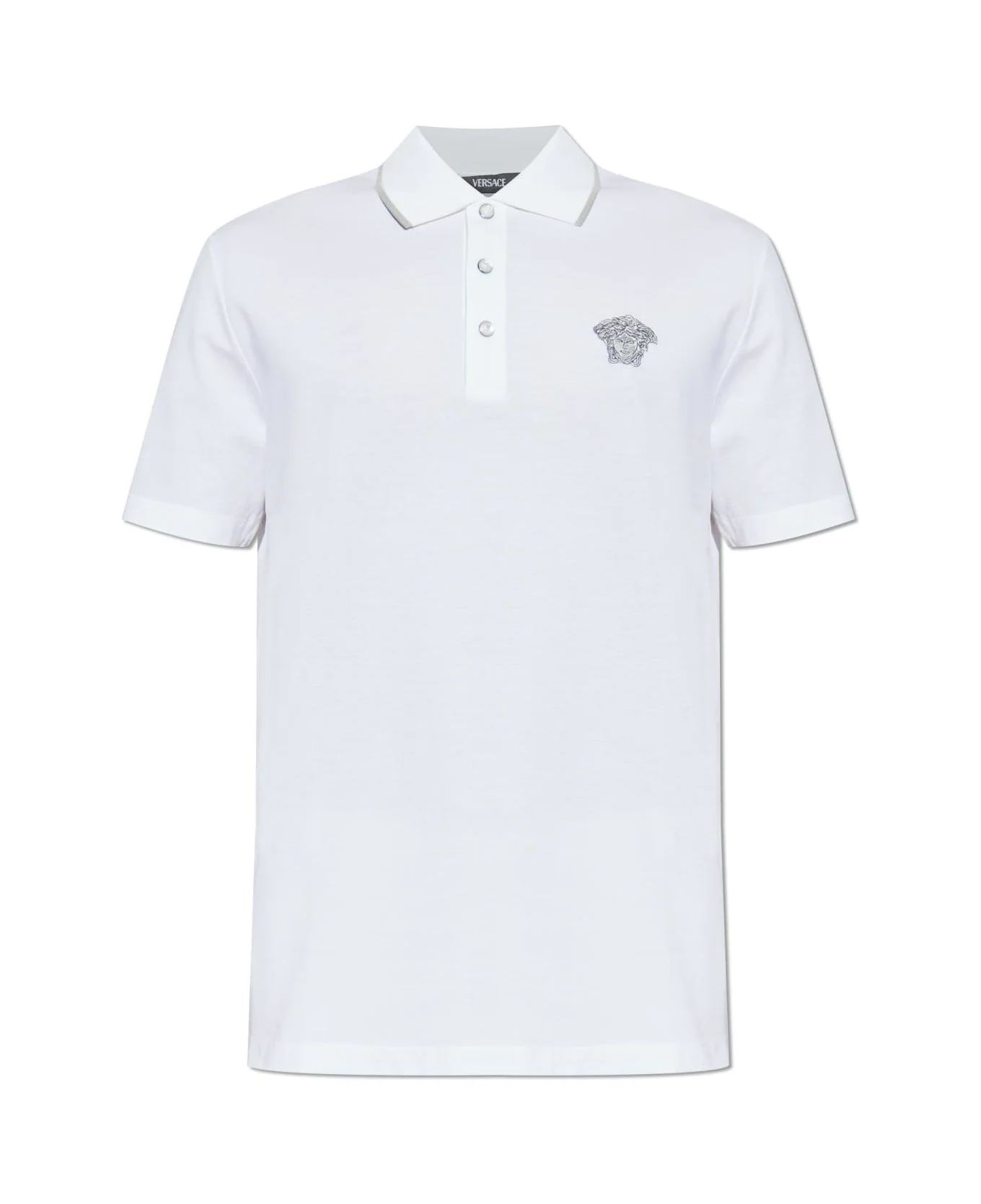 Embodying the illustrious essence of Versace, this Polo with Medusa Head isn't just a garment; it's an expression of sophisticated audacity. Crafted from the finest cotton, this classic short-sleeved polo features a traditional collar with button fastenings, exuding a timeless and versatile essence. The purity of its white fabric provides an elegant canvas for the subtle yet iconic Medusa logo on the left chest, a testament to the brand's legendary status. The three white buttons embellish the placket, adding a touch of opulence to this otherwise minimalist design, which resonates with the clean lines typical of Versace's revered repertoire. Why Purchase This Product? Crafted from high-quality cotton for ultimate comfort and luxury. Features the iconic Medusa logo, a symbol of exclusivity and style. Timeless design with a versatile white palette suitable for any occasion. Distinct button details that enhance its elegant allure. Composition: 100% Cotton 100% Cotton 100% Cotton Composition: 1. outer Fabric:, 100% Cotton;embroidery:10 Color: White Model number: 10139061A149751W000
