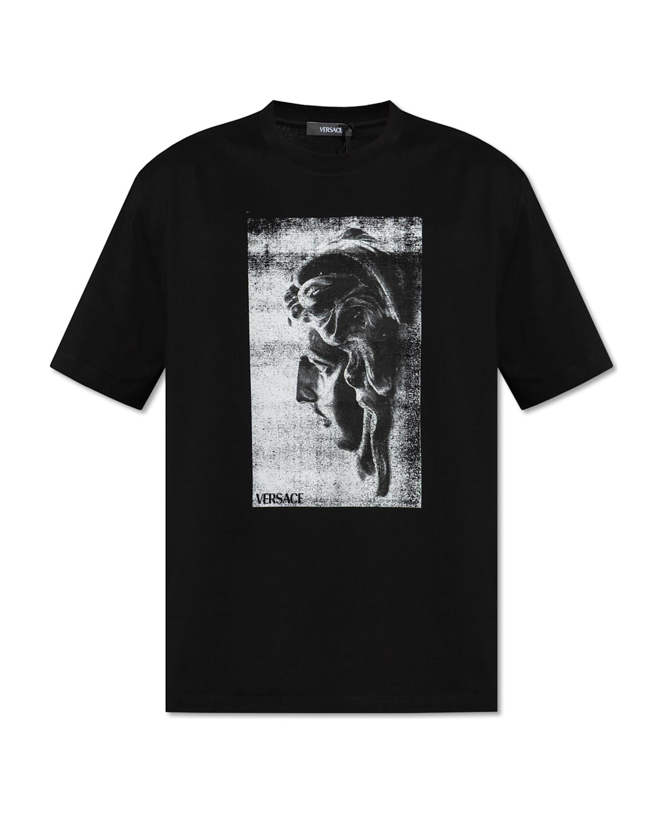 Exuding refined sophistication, this Versace Printed T-shirt is a sartorial testament to the house's enduring legacy. Crafted from smooth, premium cotton, its impeccably soft texture promises an unrivaled, breathable comfort, ideal for the discerning modern dresser. The classic crew neck silhouette features a relaxed, slightly loose fit, perfectly balancing timeless form with contemporary ease. A commanding, black-and-white graphic print depicting an antique-inspired sculptural profile crowns the chest, highlighted by the unmistakable Versace logo in the lower corner. This dynamic fusion of classical art and urban attitude exemplifies Versace's vision: a celebration of icons, innovation, and distinctive Italian artistry. Why choose this product? Luxurious, high-quality cotton for supreme comfort Iconic design and unmistakable Versace branding Timeless silhouette with a modern, relaxed fit Signature fusion of classical heritage and contemporary style An exclusive piece from one of the world's most influential fashion houses Composition: 100% Cotton Made in: Italy Color: BLACK Model number: 1A150851013302