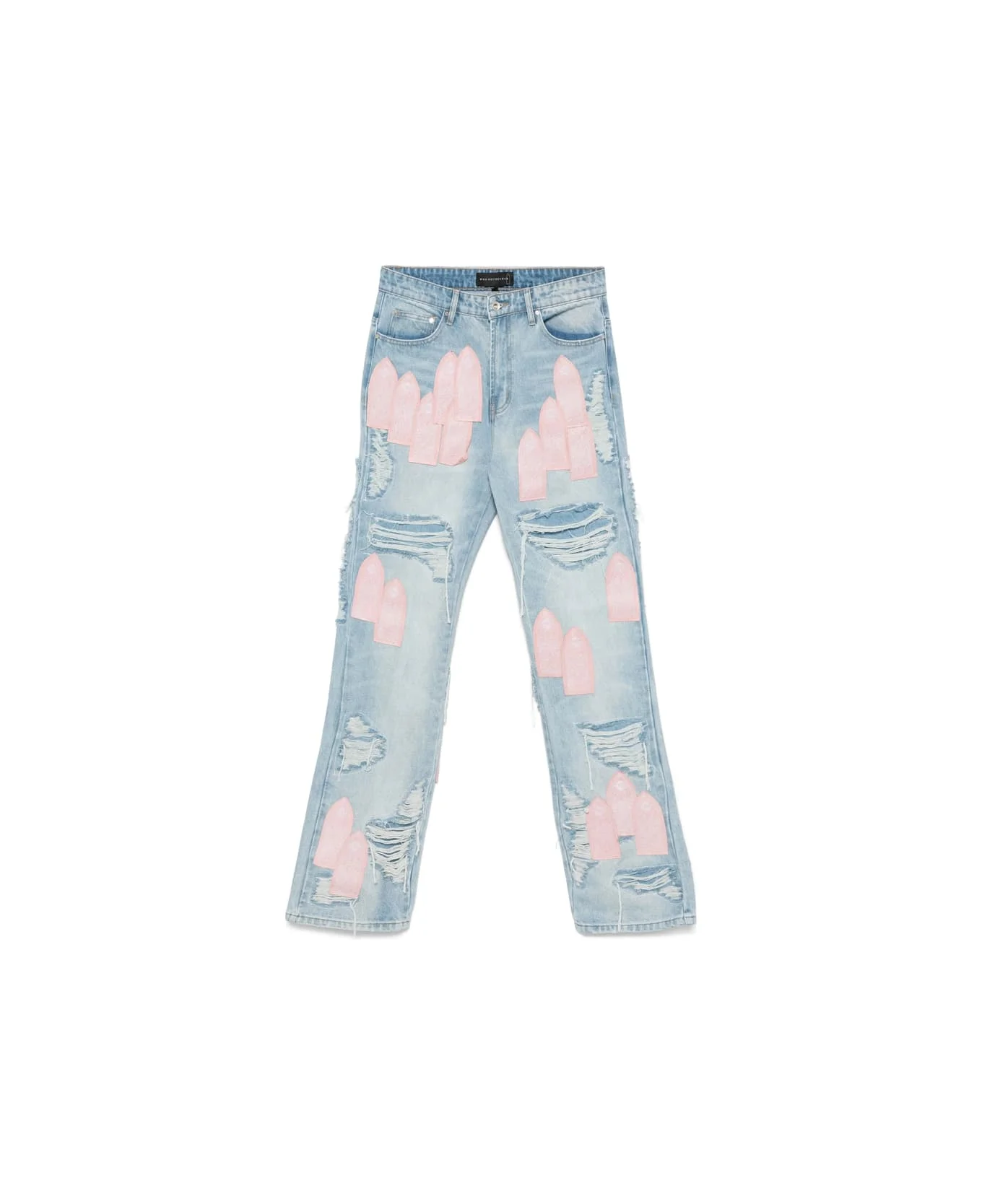 sky blue front button and zip fastening belt loops classic five pockets logo patch to the rear Made in: China Color: BLUE/PINK Model number: EASTERPINK