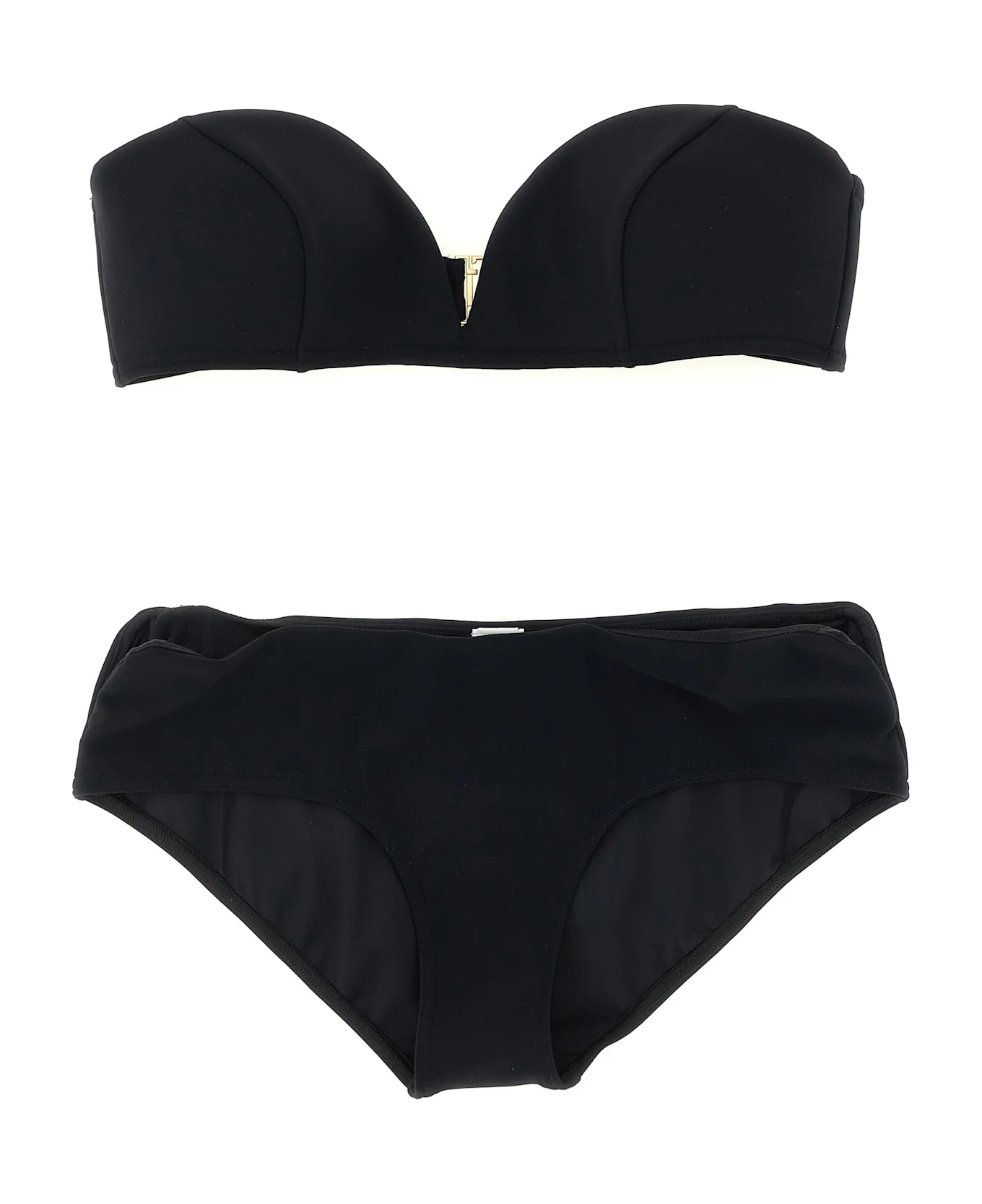 'Wanderlust Curve' bikini in technical fabric consisting of a bandeau top with preformed cups, back hook closure, adjustable and removable shoulder straps, and briefs with classic cover and upper side slits with inner V-shaped underwire. Composition: 75% polyamide, 25% elastane Made in: Vietnam Color: Black Size and fit: - true to size fit Model number: 7704WRS262BLK