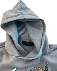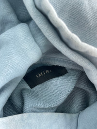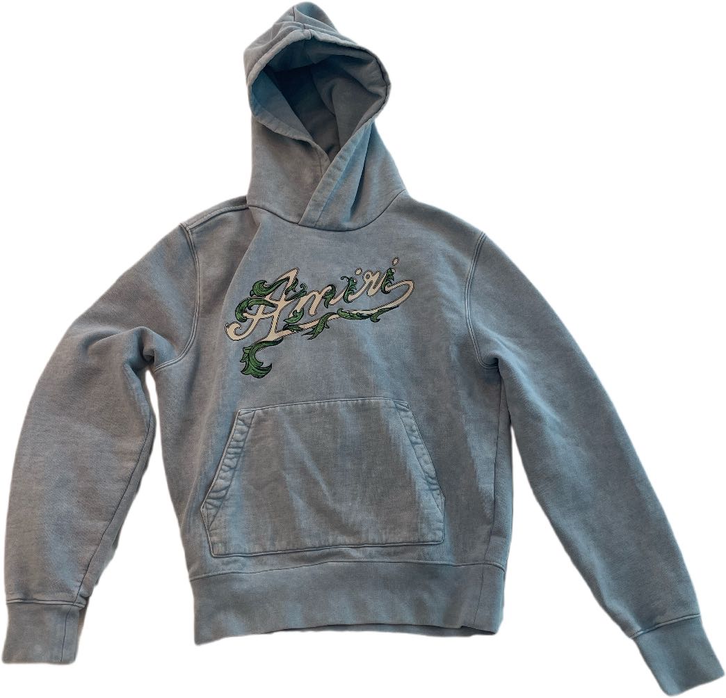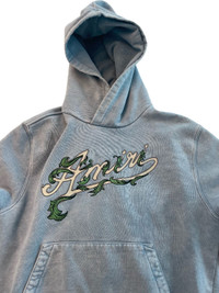 Amiri hoodie, size X-Small. Washed light blue with Green filigree-style embroidery with the logo. 100% Cotton. Super clean look—Barley Worn. Overall hoodie is in great condition. No holes, no major wear. • Condition: 9/10 • Retail: ~$970 • 100% authentic • Ships fast Asking $772, open to reasonable offers.