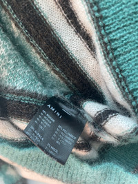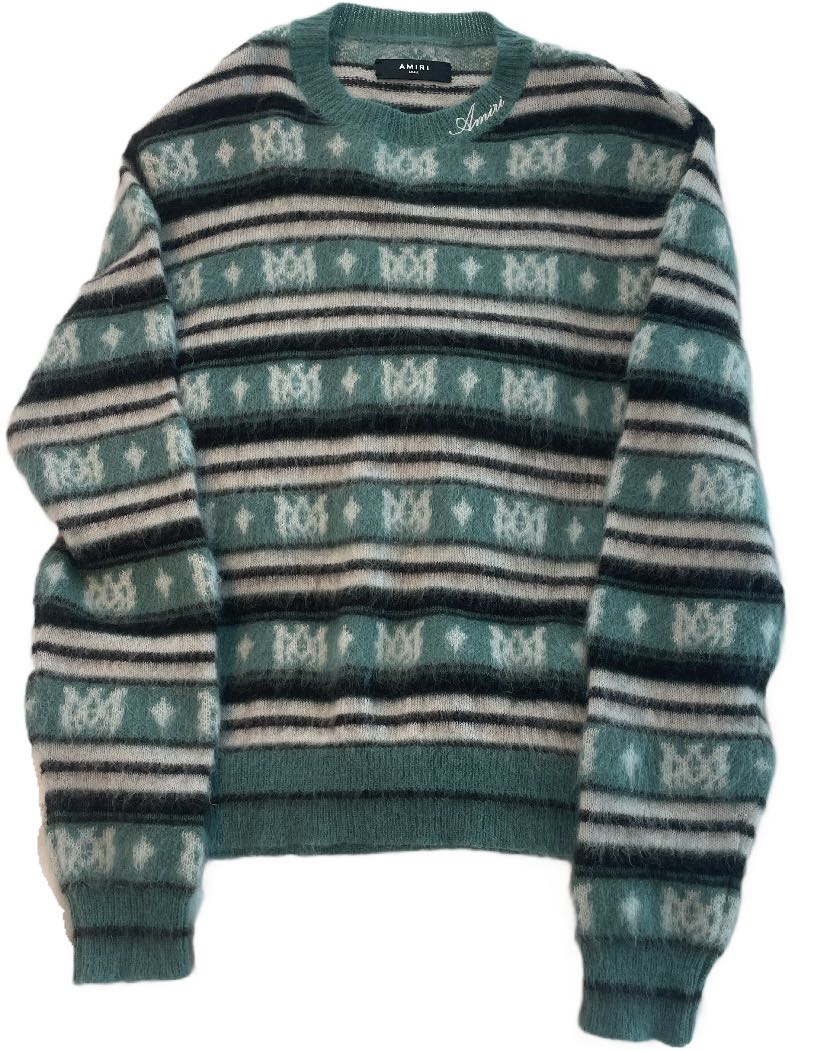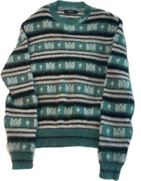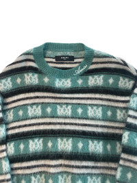 Amiri Monogram Mohair Sweater size Small. Striped teal/black/white colorway with all-over AMIRI monogram design. Super soft mohair blend—warm and super comfortable, premium feel, made in Italy. Sold out almost everywhere. Never Worn. No holes or damage. Minor fuzzing from storage. • Size: Small • Condition: 10/10, excellent shape • Made in Italy • Mohair-wool blend • 100% authentic • Retail: ~$990 • Ships Fast Asking $719, open to offers.