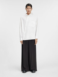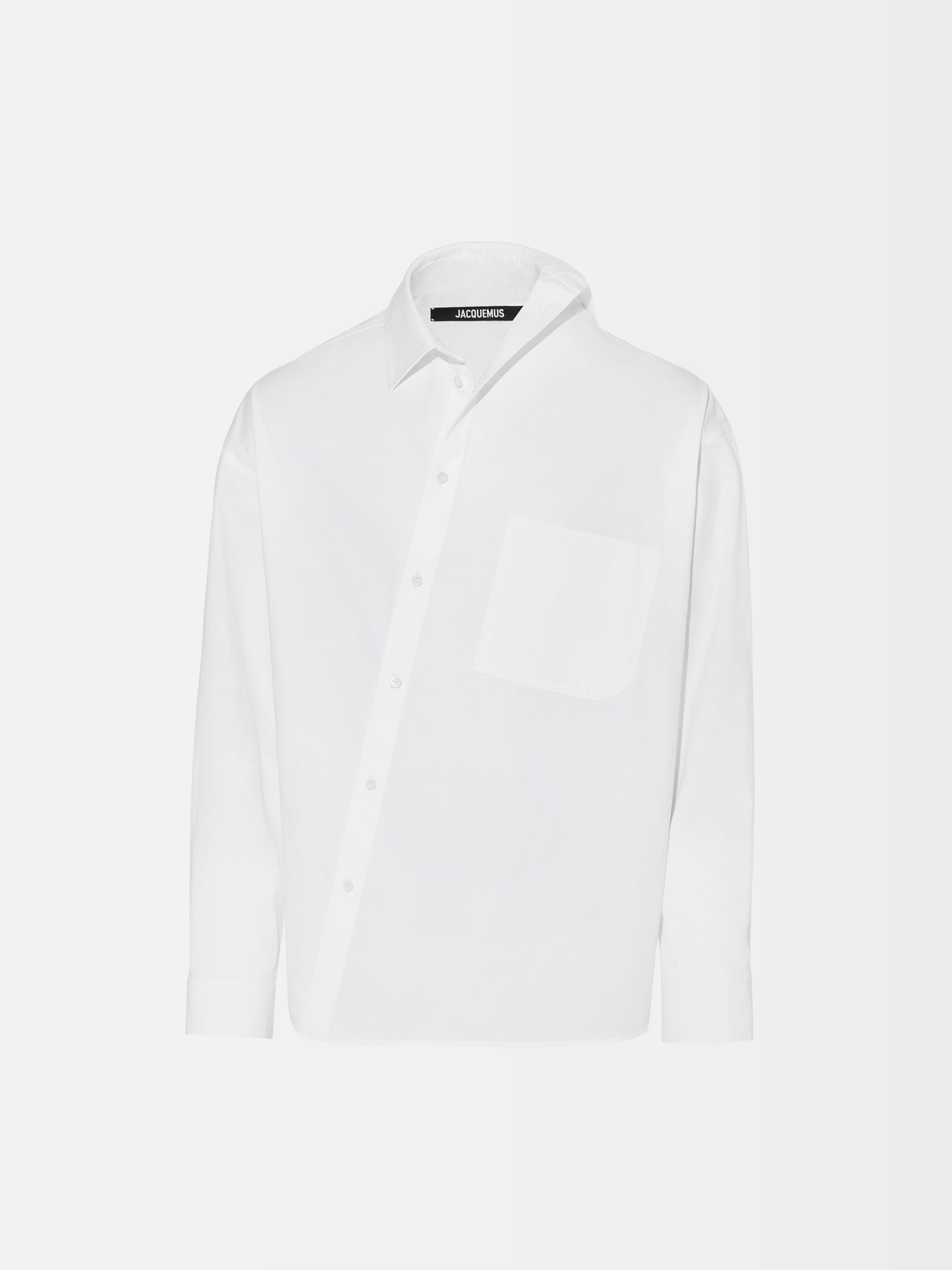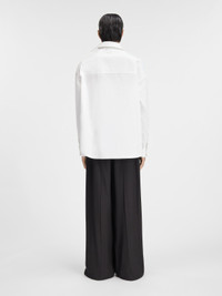 LES SCULPTURES Asymmetric shirt - Oversized asymmetric fit - Cotton poplin - Asymmetric pointed collar - Asymmetric “J” shaped chest pocket - Asymmetric button placket - Square cuffs - Engraved mother-of-pearl buttons - “J” locker loop The model is 186 cm and wears a size 48 100% Cotton Made in Bulgaria Ref.245SH080-1520-100