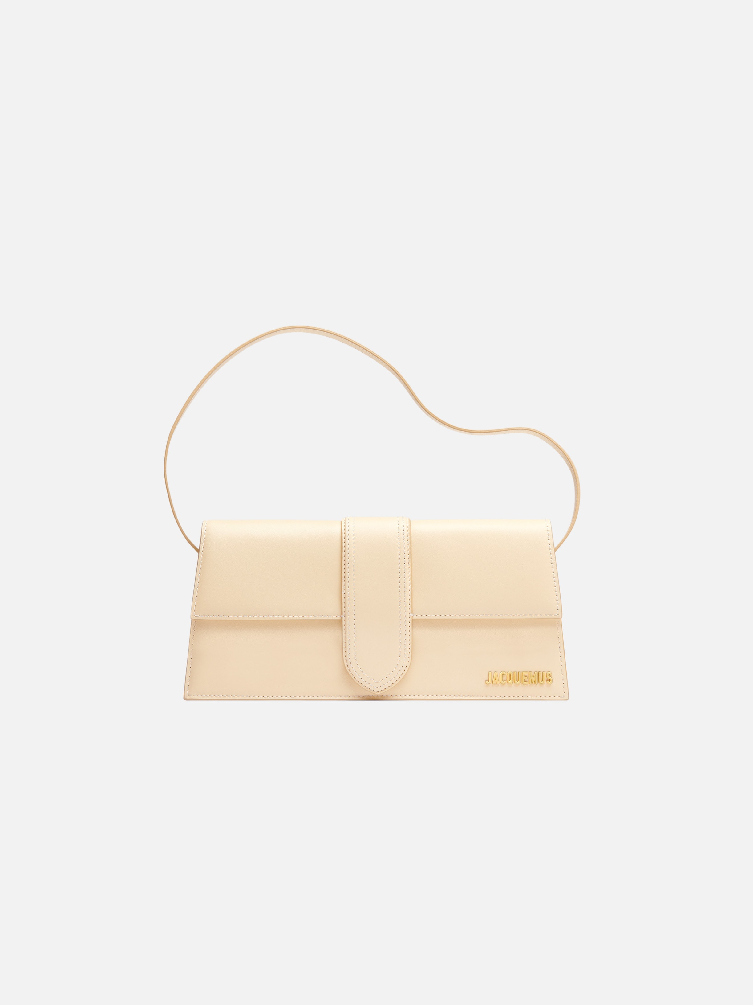 Les Classiques Long flap bag. - Smooth leather structured shoulder bag - Magnetic flap tab closure - Slim shoulder strap - Back patch pocket - Interior card pocket - Gold metal logo and hardware - Fully lined in cotton - Dyed edges - 28 x 13.5 cm 100% Cowskin Made in Italy Ref. 221BA013-3060-120
