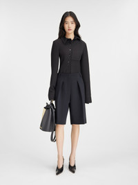LES SCULPTURES Curved bermudas - High-waisted - Short, curved fit - Grown-on waist - Belt loops - Hidden zip and button closure - Pressed pleats - Split waistband in the back - Back welt pocket with "J" button loop The model is 178 cm and wears a size 34 100% Polyester / Lining: 97% Cotton - 3% Elastane Made in Bulgaria Ref.241PA081-1526-990