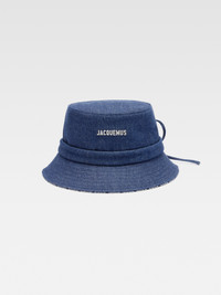 LA CASA Knotted bucket hat - Raw indigo denim hat - Silver metal logo - Visible topstitched drawcord in the back that can be knotted - Topstitched brim - Striped lining 100% Cotton Made in Bulgaria Ref.223AC001-1513-38F
