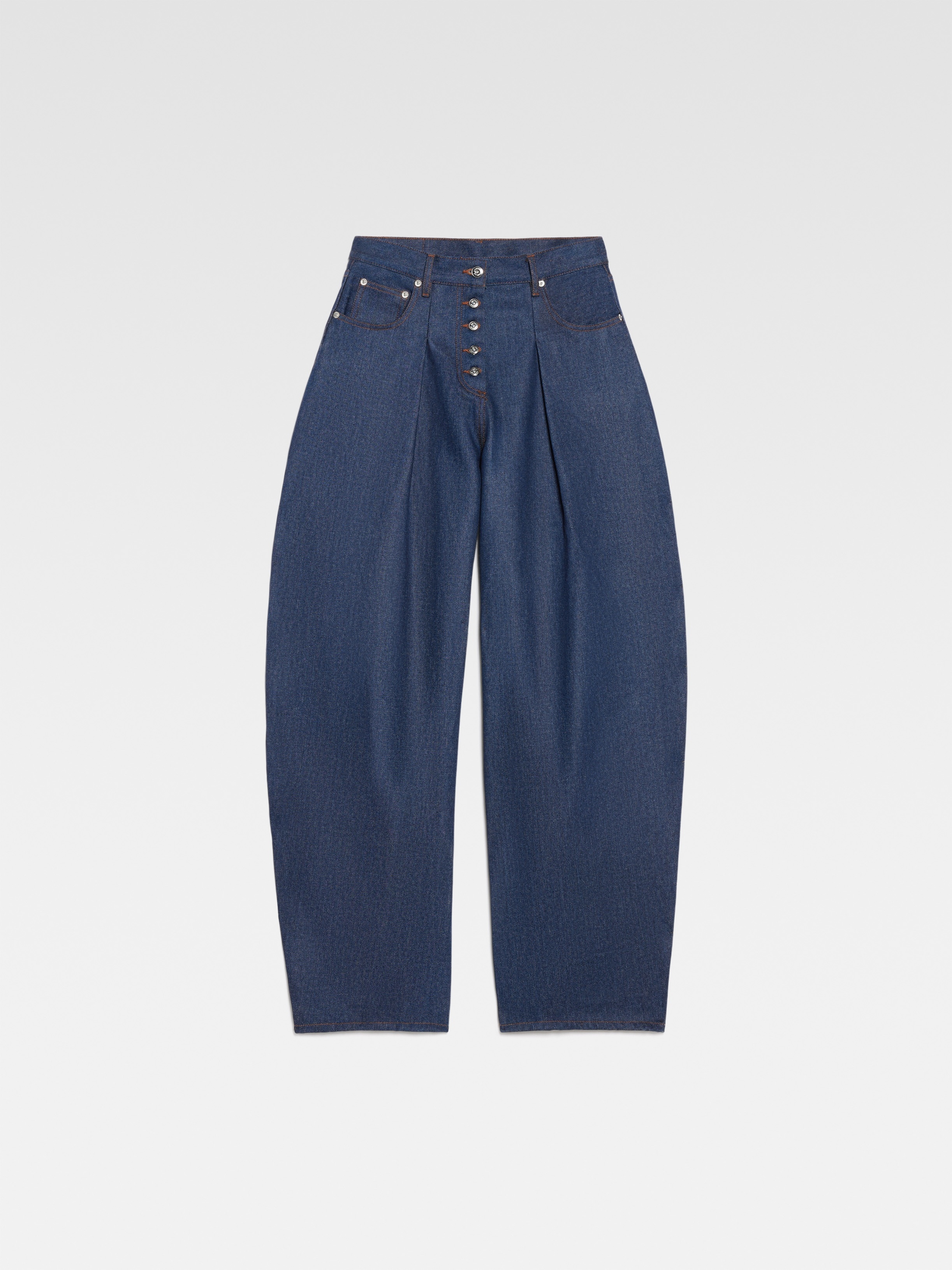 LES SCULPTURES Wide curved jeans - Mid rise - Raw indigo denim - Long curved leg - Four pockets with “J” shaped back pocket - Metal studs and rivets - Button fly - Pleated waist - Large denim patch above back pocket - Contrast stitching The model is 178 cm and wears a size 26 100% Cotone Made in Portugal Ref.241DE041-1513-38B