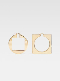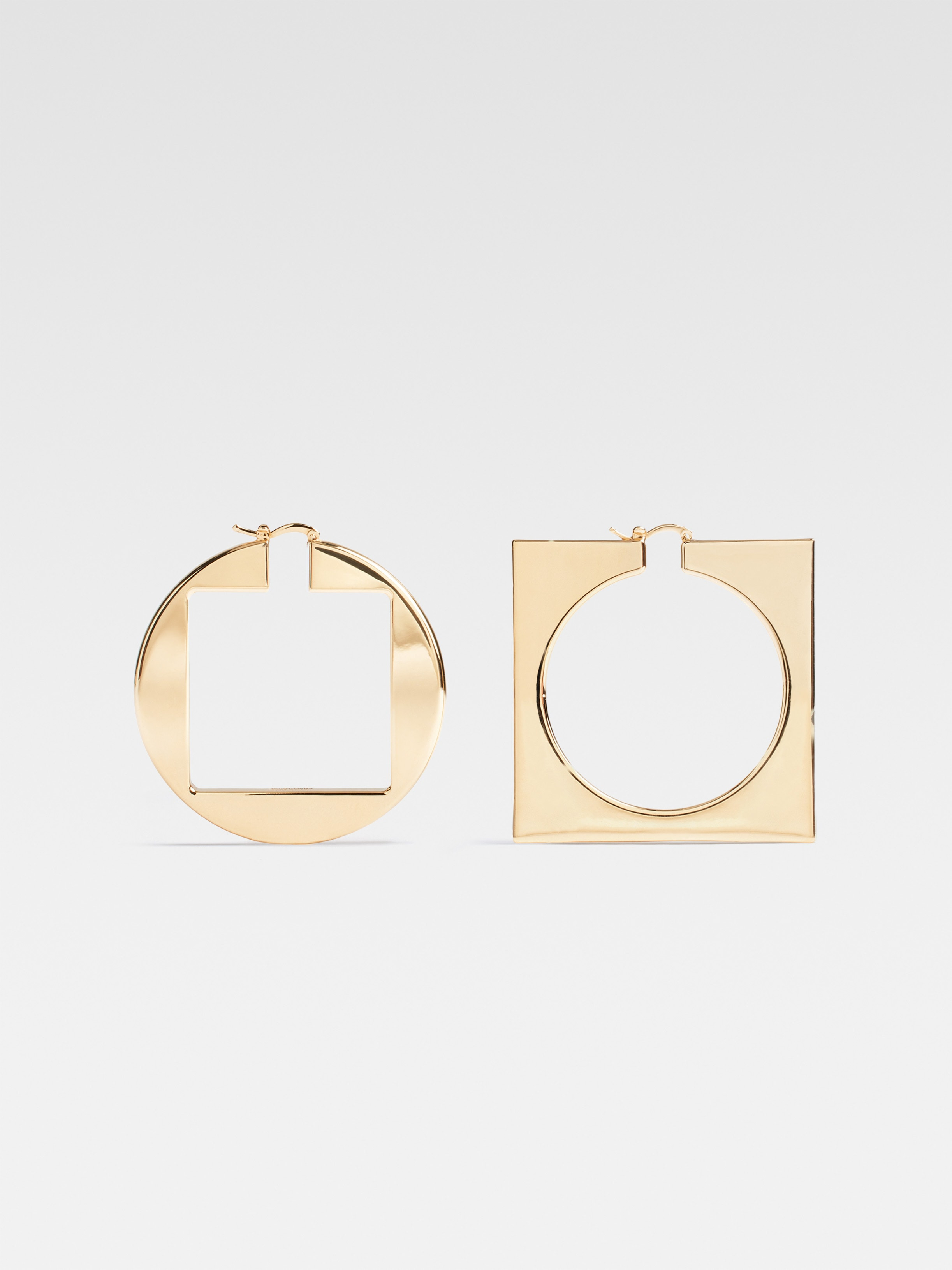 Les Classiques Circle and square hoops - Plated brass asymmetric hoop earrings - Flat square and circle shapes - Hinge clasps - Smooth finish - Diameter: 5 cm - Weight: 14.50g 98% Aluminium - 2% Brass Made in Italy Ref. 233JW639-5845-270