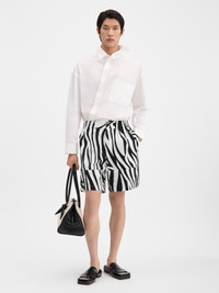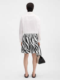 Zebra Arty print boxer shorts - Boxer effect shorts - Mid-rise waist - Wide knee-length leg - Zebra Arty print - 4 pockets on front and back - Elasticated waistband - Zip fly on front - Visible button on waistband - "Jacquemus" embroidery on back pocket, right side The model is 185cm and wears a size 48 100% Cotton / Lining: 55% Cotton - 45% Polyester Made in Bulgaria Ref. 255PA138-1705-9CC