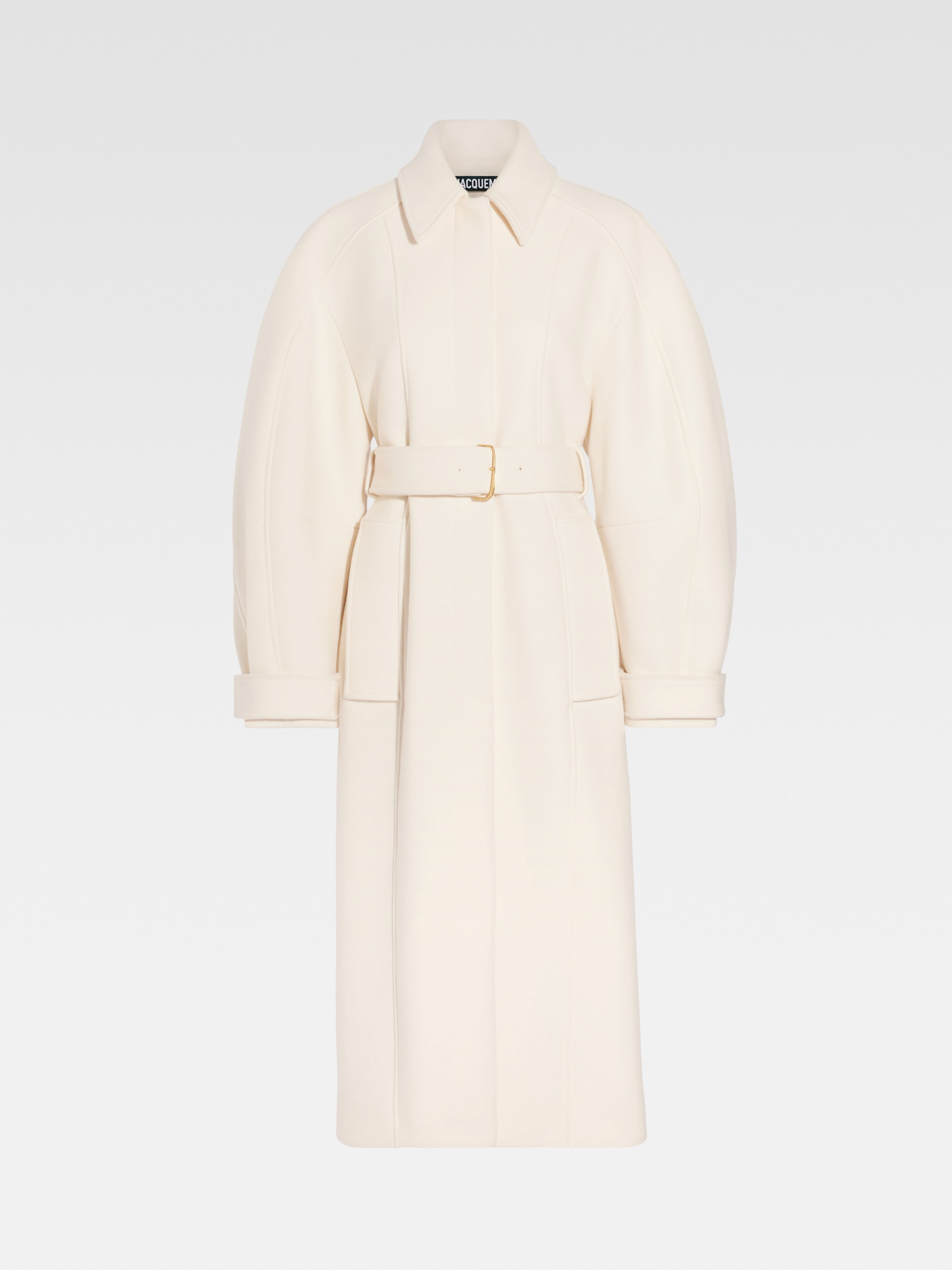 LA CASA Raglan-sleeve coat - Mid-calf length - Round fit with fitted waist - Winter wool twill - Pointed collar - Piped seams - Round raglan sleeves - Hidden snap-button placket - Removable belt with metal buckle - Belt loops - Straight fit from the waist - Oversized welt pockets - Snap-button sleeve tabs - Back yoke with “J” locker loop - High back-slit - Gold metal hardware - Fully lined The model is 180cm and wears a size 34 100% Virgin wool Made in Bulgaria Ref. 243CO068-1614-110