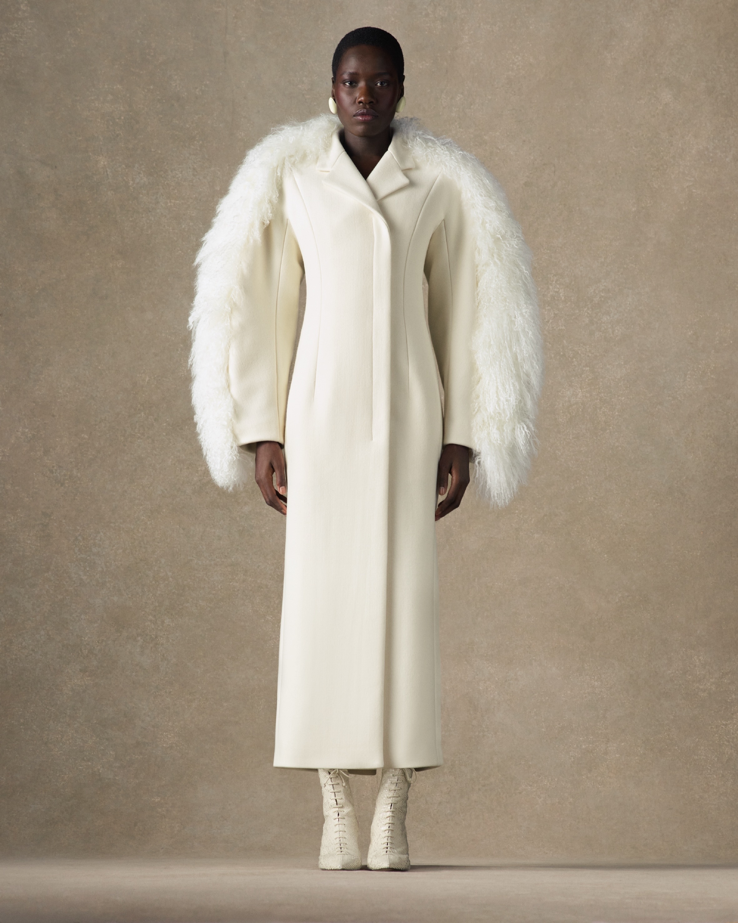 Shearling boa coat - Long straight fit - Heavy bonded wool - Mongolian shearling boa-shaped trim - Small notched lapel - Hidden snap-button closure - Fitted waist - Side-seam pockets - Back slit The model is 180cm and wears a size 34 100% Virgin Wool / Lining: 52% Viscose - 48% Cotton Made in France Ref. COW00116AW00429110