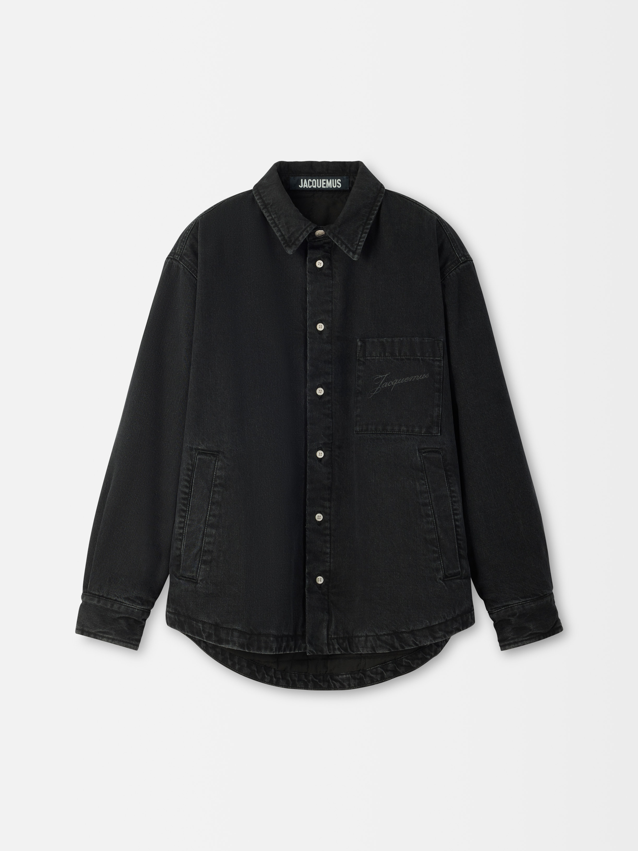 Puffed overshirt - Boxy fit - Washed black denim - Pointed collar with engraved metal button - Laser-printed logo on the chest - Side welt pockets - Buttoned cuffs - Back yoke with “J” loop - Fully padded and lined - Mother-of-pearl buttons The model is 187cm and wears a size 48 100% Cotton / Lining: 65% Polyester - 35% Cotton Made in France Ref. OUM00115AD00019990
