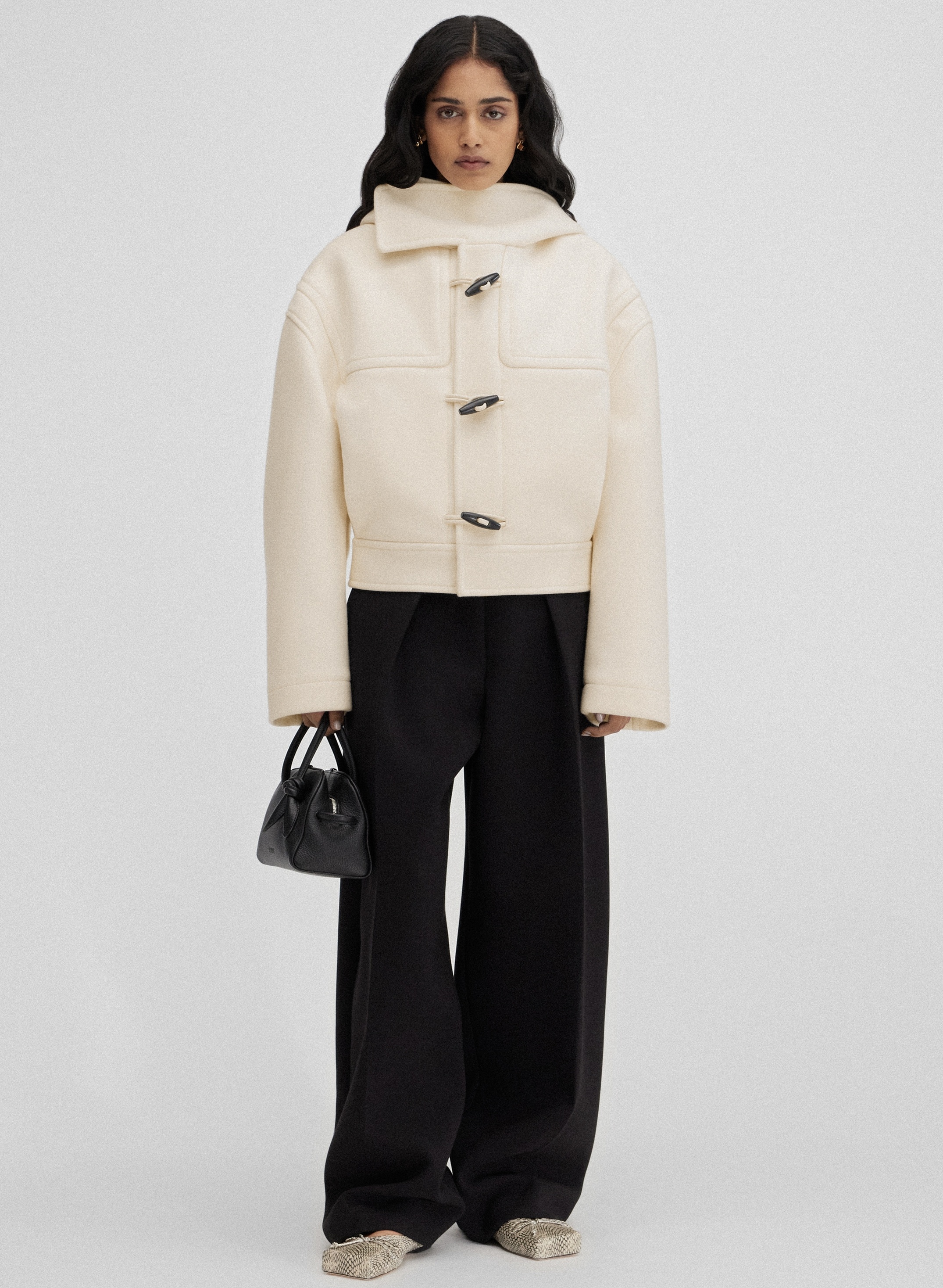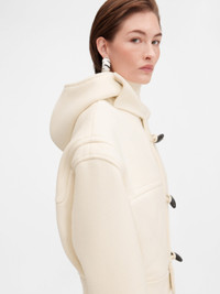 Round duffle coat - Oversized fit - Virgin wool - Adjustable stand collar with snap buttons - Hood - Wide rounded shoulders - Toggles and leather loop fasteners - Side-seam pockets - Fully lined The model is 178cm and wears a size 34 100% Virgin wool / Lining: 55% Cotton - 45% Polyester Made in Bulgaria Ref. 251CO097-1614-110