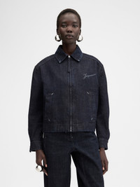 LA CROISIERE Zipped denim jacket - Oversized fit - Dark navy cotton denim - Pointed collar - Long sleeves - Contrast bartacks - Zipper closure with denim puller - Laser printed signature logo - Side welt pockets - Buttoned cuffs with corozo buttons - Back yoke with embroidered patch The model is 179cm and wears a size 40 100% Cotton / Lining: 65% Polyester - 35% Cotton Made in Italy Ref. OUW00100AD00036390
