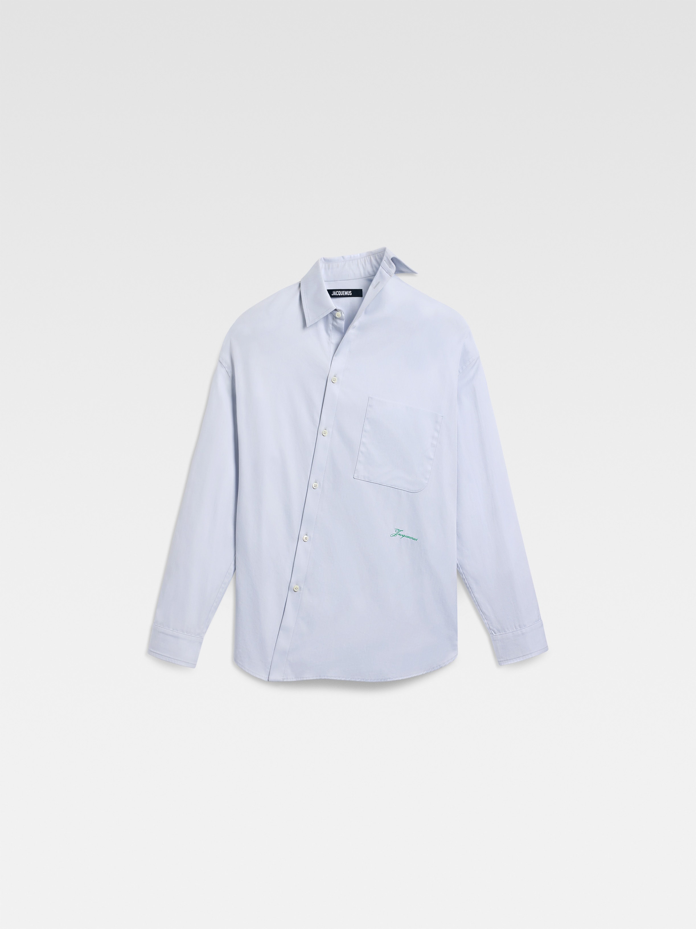LA CROISIERE Asymmetric shirt - Oversized asymmetric fit - Herringbone cotton - Asymmetric pointed collar and button placket - Asymmetric “J” shaped chest pocket - Green 50’s embroidered logo - Long sleeves - Square cuffs - Back yoke - “J” locker loop - Mother-of-pearl buttons The model is 179cm and wears a size 36 100% Cotton Made in Bulgaria Ref. 251SH086-1726-910