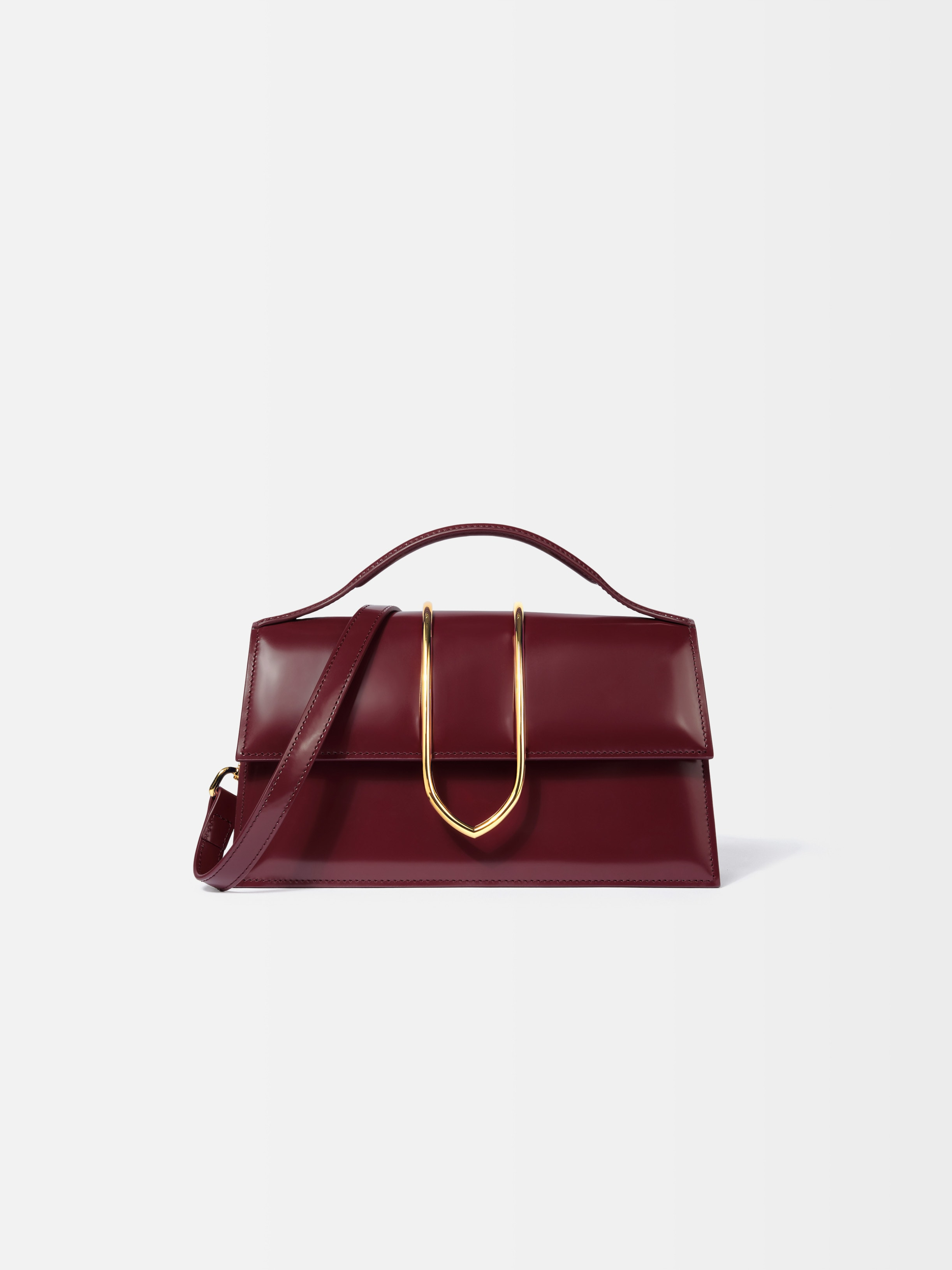 Cross-body metal flap bag - Structured shoulder bag in glazed leather - Gold metal tab-outline closure - Magnetic flap - Small reinforced handle - Removable shoulder strap - Back patch pocket with embossed logo - Interior card pocket - Gold metal hardware - Fully lined in cotton - 5,1 in x 9,2 in Each leather is unique and has been carefully selected by our team. To maintain the original condition of this item, we recommend to avoid direct and over-exposure to light and contact with cosmetics, water or heat. We advise to store this item into the dust bag in a dry place. 100% Calf Leather Made in Italy Ref. BAW00406BC18A01490