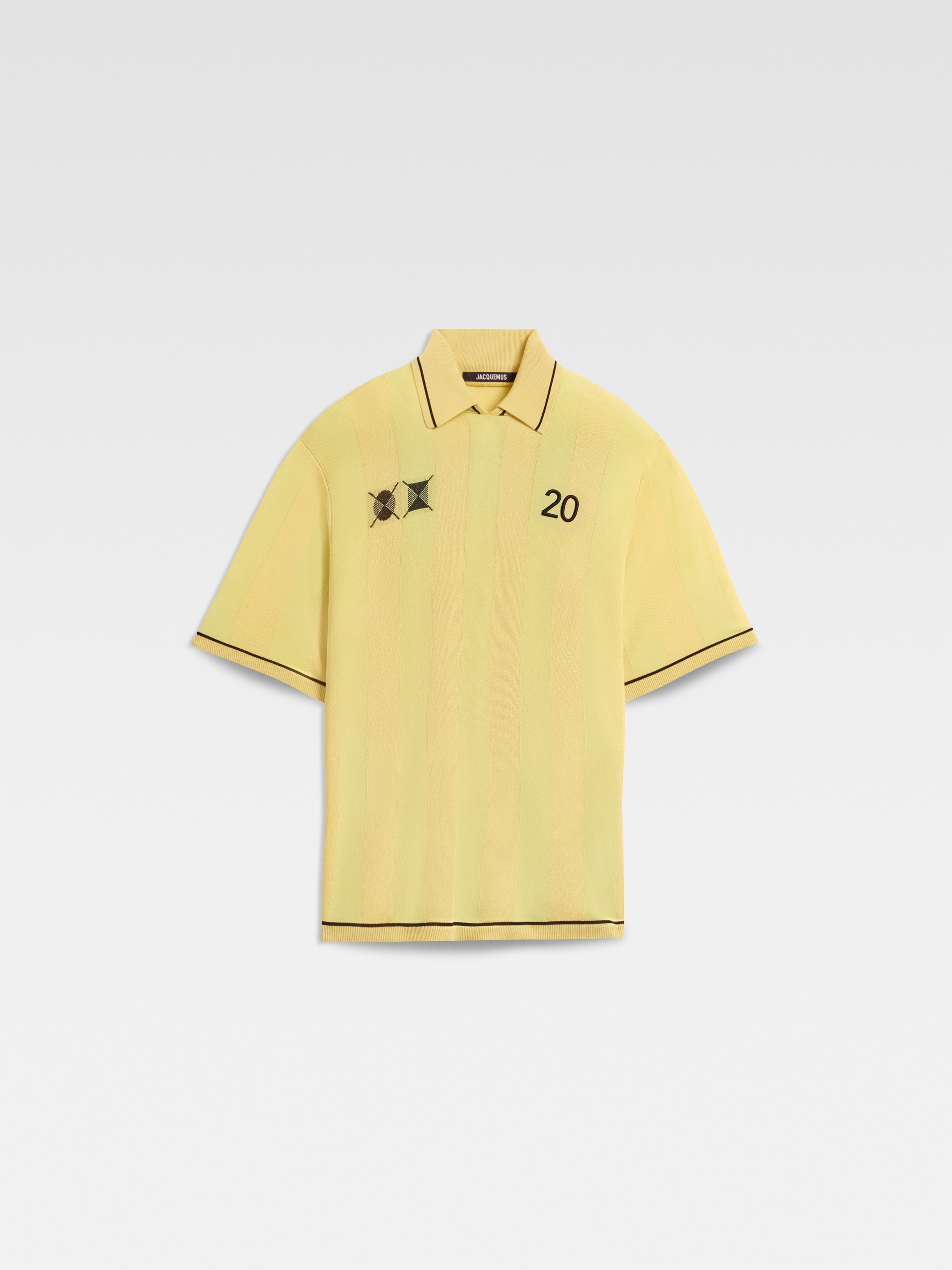 LA CROISIERE Jacquard polo shirt - Loose fit - Jacquard knit - Matt and shiny vertical stripes - Boxy elbow-length sleeves - Ribbed collar, cuffs and hem - Circle and square argyle jacquard detail - Contrast "20" embroidery on chest - Jacquard Jacquemus Club logo label on the back The model is 190cm and wears a size M 91% Viscose - 8% Polyamide - 1% Elastane Made in Romania Ref. 255KN542-2432-210
