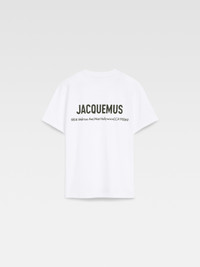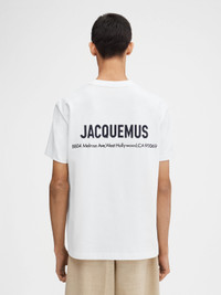 Short-sleeved t-shirt with printed address and logo - sold exclusively online and in our Los Angeles store - Regular fit - Ribbed crewneck - Printed logo on chest - Printed address of the Jacquemus boutique on back - Exclusive model designed for the opening of the JACQUEMUS store in Los Angeles Men : The model is 190cm and wears a size M Women : The model is 179cm and wears a size S 100% Cotton Made in Portugal Ref. TSU00158AJ002261JP