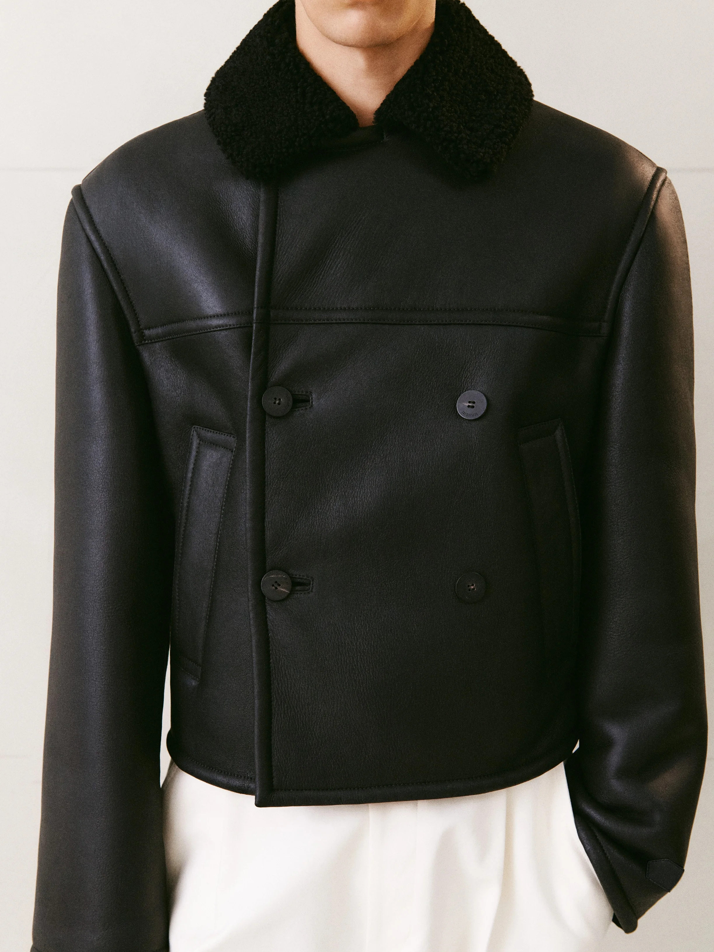 Short shearling pea coat - Straight fit - Leather exterior and soft fleece interior - Shearling collar - Long sleeves - Double-breasted - Large welt pockets - Back and front yoke - Embroidered Calisson patch with logo on lower left sleeve - Corozo buttons The model is 187cm and wears a size 48 100% Sheepskin / Lining: 100% Cotton Made in Turkey Ref. 255CO059-1664-990