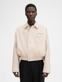 Blouson jacket - Short oversized fit - Wool suiting fabric - Pointed collar - Long sleeves - Hidden button closure with two visible buttons - Buttoned jet pockets - “J" button loop - Side pockets - Buttoned cuffs - Box pleat in the back - Elasticated hem - Corozo buttons The model is 187cm and wears a size 48 100% Virgin wool / Lining: 100% Cotton Made in Bulgaria Ref. 255CO072-1719-130