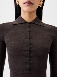 Sheer knit polo - Fitted shape - Light merino blend knit - Ribbed hem - Embroidered “J” on the collar - Long polo placket - Stretched open buttonholes - Fitted buttoned sleeves - Fully buttoned back - Small horn buttons The model is 175cm and wears a size 34 98% Merino Wool - 2% Polyamide Made in Romania Ref. POW00806AK00145880