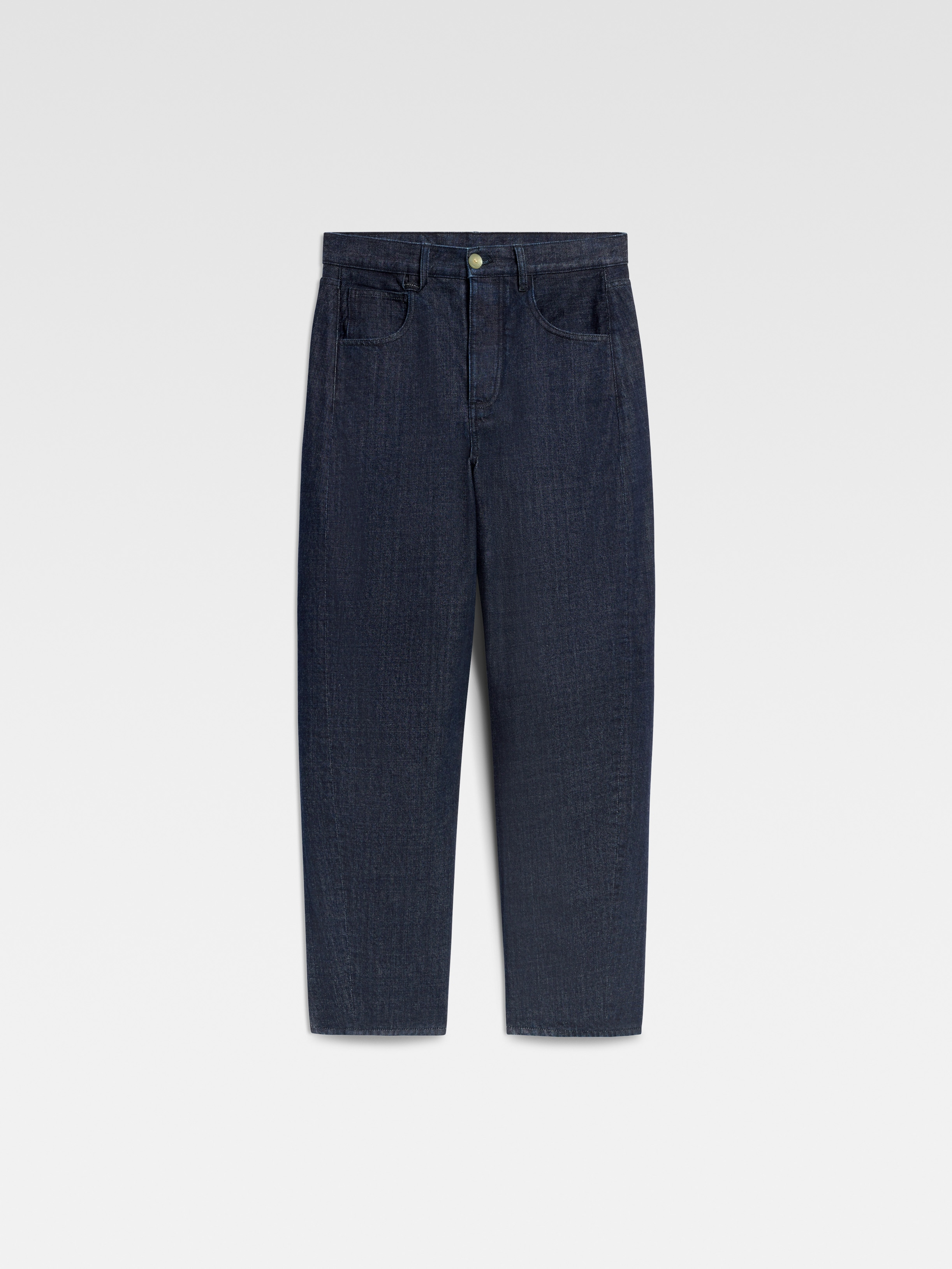 Curved jeans - Mid-rise - Dark navy cotton denim - Long curved leg - Five pockets - Buttoned fly - Contrast corozo buttons - “J" belt loop - Embroidered patch on the back - Laser printed 50s signature logo The model is 192cm and wears a size 30 100% Cotton / Lining: 65% Polyester - 35% Cotton Made in Portugal Ref. 255DE053-1782-390