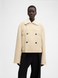 Double-breasted shearling jacket - Straight fit - Leather exterior and soft fleece interior - Shearling collar - Long sleeves - Double-breasted closure - Large welt pockets - Embroidered patch on lower left sleeve - Double stitched seams - Back yoke - Corozo buttons - Calisson logo patch on lower left sleeve The model is 180cm and wears a size 40 100% Sheepskin / Lining: 100% Cotton Made in Turkey Ref. 251CO101-1664-110