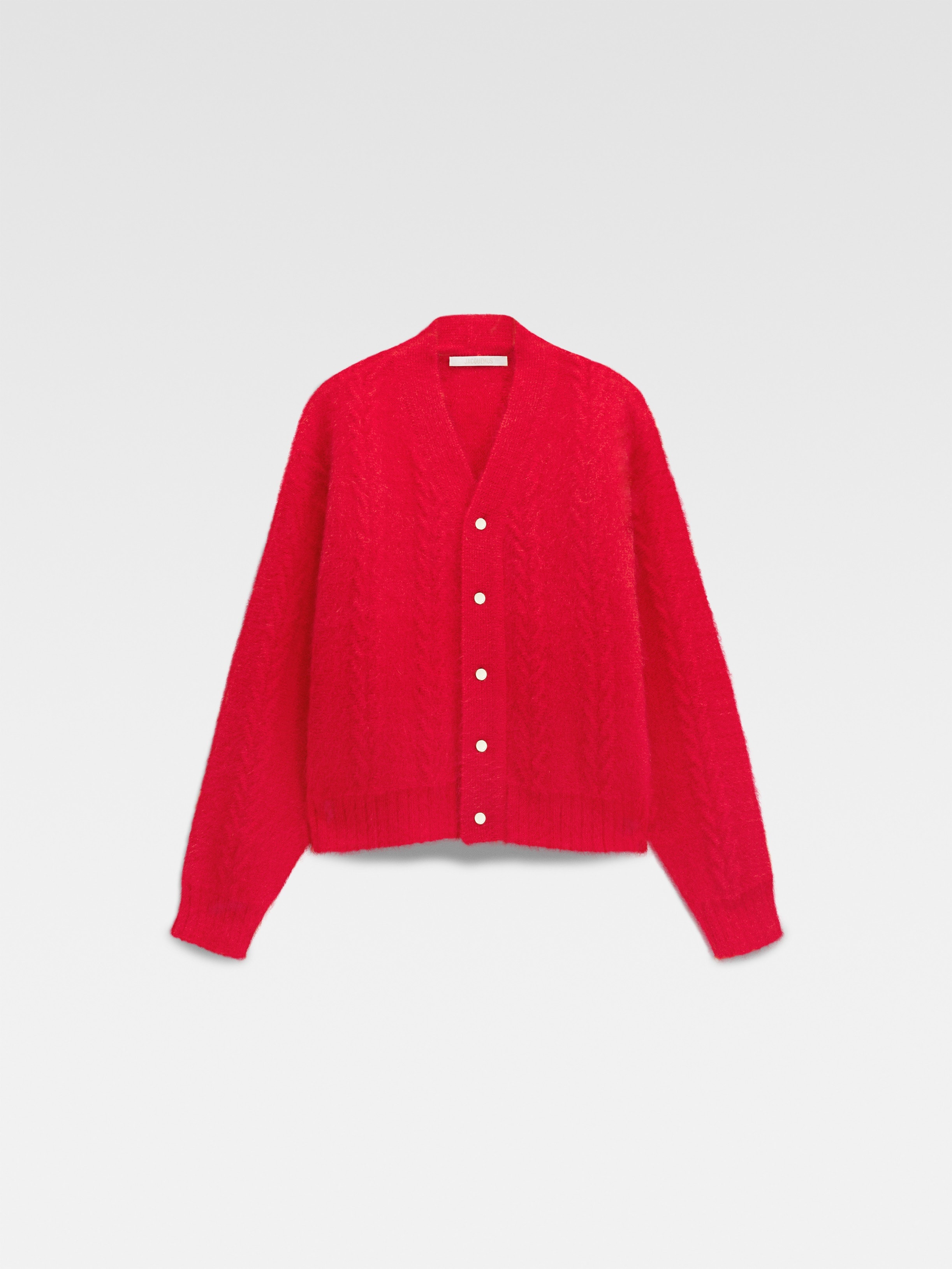 WINTER RETREAT Mohair buttoned cardigan - V-neck buttonned cardigan - Relaxed fit - Twisted pattern - Silver buttons fastening - Ribbed cuffs and hem - Silk JACQUEMUS label on back Men: The model is 185cm and wears a size M Women: The model is 175cm and wears a size S 81% Mohair - 17% Polyamide - 2% Elastane Made in Italy Ref. 246KN533-2019-470