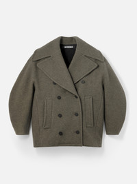 Round peacoat - Rounded shape - Heavy bonded virgin wool - Wide notched lapel - Double-breasted closure - Wide, rounded sleeves - Large welt pockets - Embroidered “J” on the sleeve - Horn buttons - Fully lined The model is 178cm and wears a size 38 100% Virgin wool / Lining: 52% Viscose - 48% Cotton Made in Bulgaria Ref. COW00103AW00624580