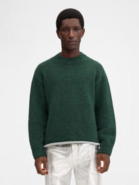 WINTER RETREAT Jacquard logo sweater - Loose fit with long sleeves - Brushed alpaca knit - Crewneck - Ribbed collar, cuffs and hem - Rolled detail at lower body - Contrast jacquard logo on back 50% Alpaca wool - 20% Polyamide - 15% Polyester - 10% Wool - 5% Elasthanne Made in Bulgaria Ref. 236KN290-2354-590