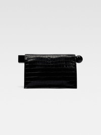 Take-out clutch - Crocodile-embossed and shiny leather folded clutch - Rolls open to access interior - Large acetate circle and square closure endings - Magnetic closure - Interior card pocket - Gold metal logo and hardware - Fully lined in cotton - Height 17 cm - Length 27.7 cm - Width 12.20 cm - Opening: 35 cm Each leather is unique and has been carefully selected by our team. Irregularities and variations in shade are natural. To maintain the original condition of this item, we recommend to avoid direct and over-exposure to light and contact with cosmetics, water or heat. We advise to store this item into the dust bag in a dry place. 100% Calfskin / Lining: 100% Cotton Made in Italy Ref. 233BA356-4301-990