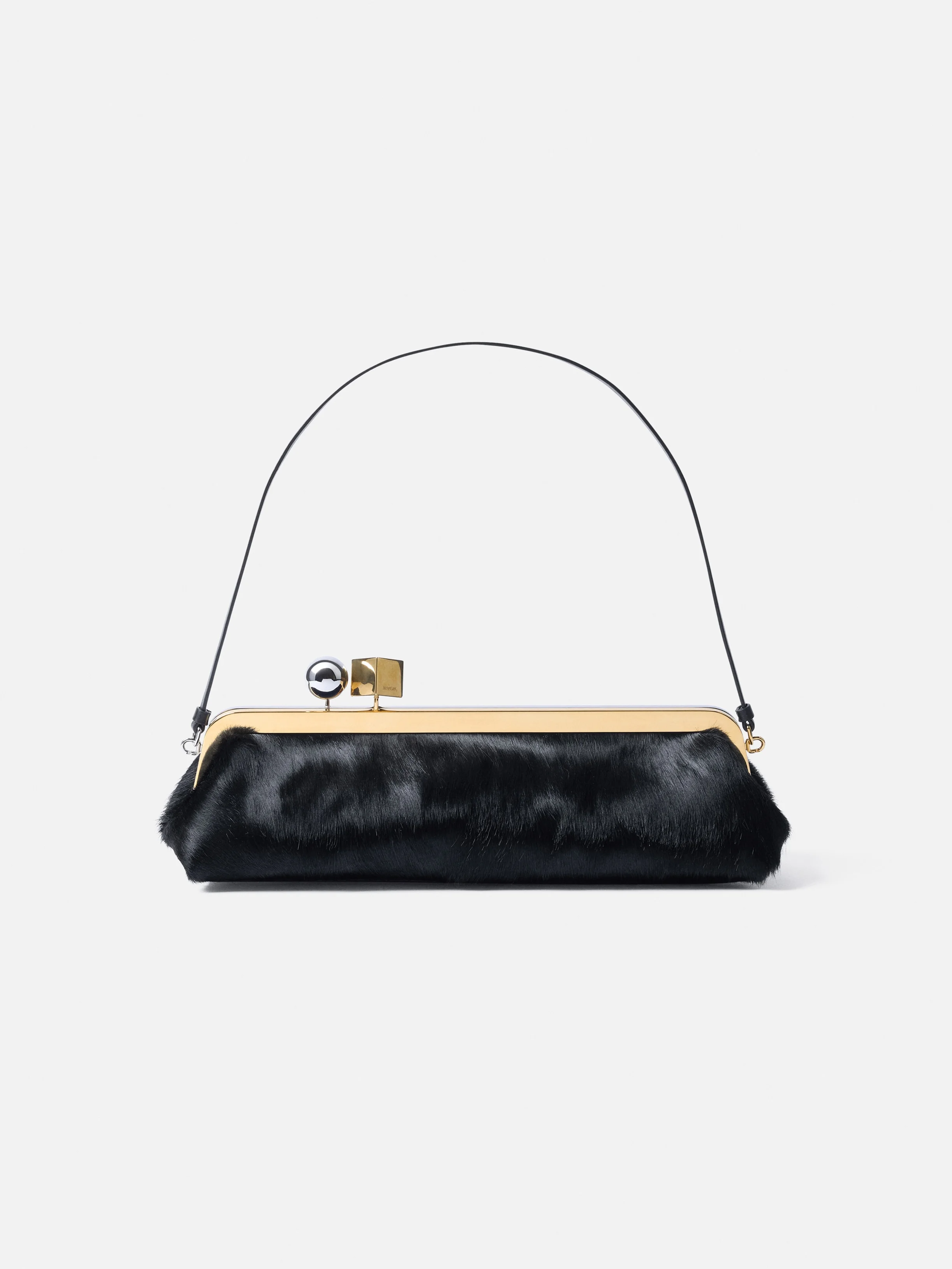 Long clasp bag - Long clutch bag in pony hair - Removable thin shoulder strap - Contrast Rond-Carre clasp closure in silver and gold metal - Interior leather patch pocket - 35 x 12 x 8.5 cm Each leather is unique and has been carefully selected by our team. To maintain the original condition of this item, we recommend to avoid direct and over-exposure to light and contact with cosmetics, water or heat. We advise to store this item into the dust bag in a dry place. 100% Cow leather Made in Italy Ref. BAW00413AC10C03990