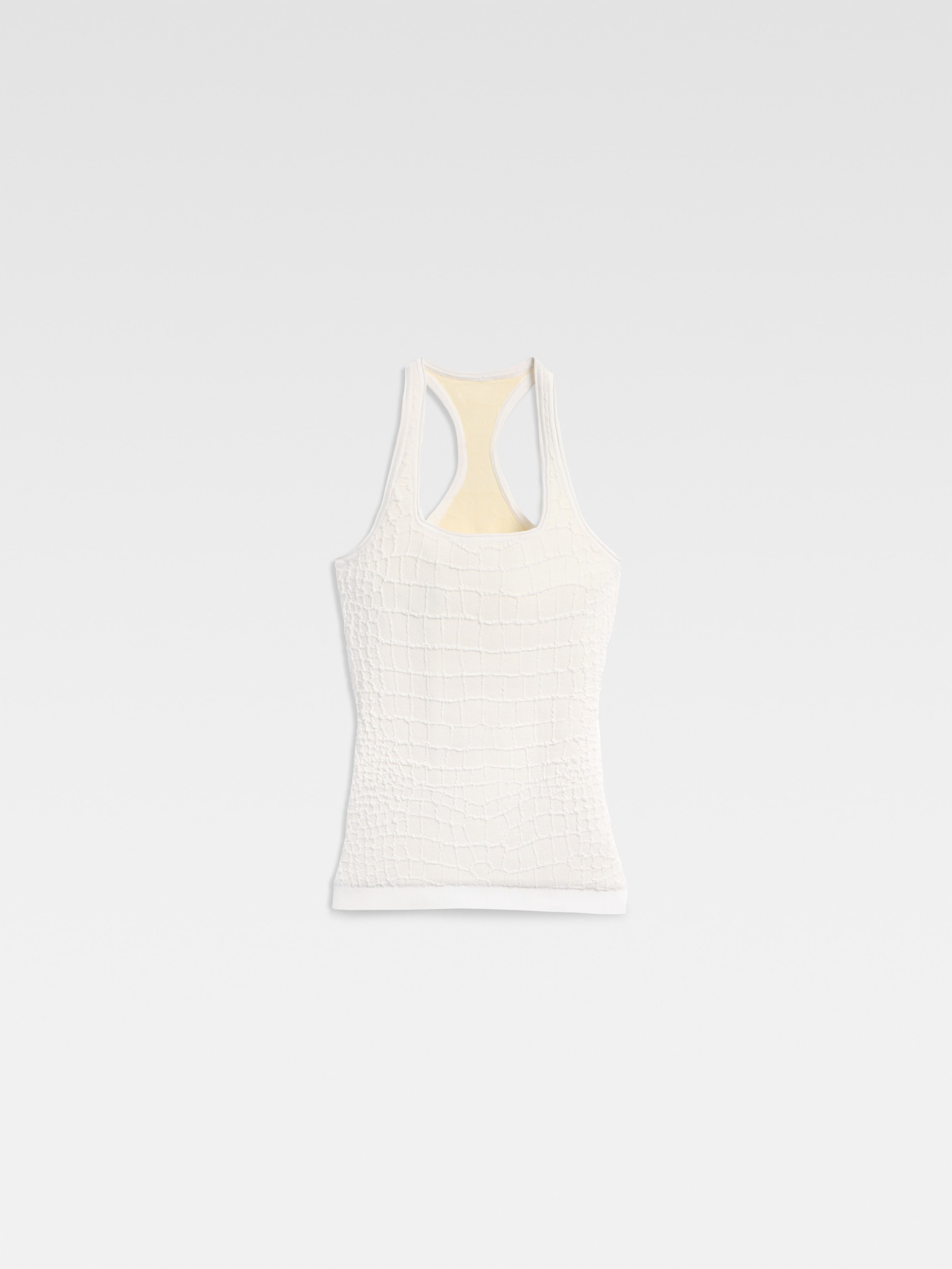 Racerback tank-top - Fitted shape - Crocodile embossed stretch viscose - Square neckline - Raceback - “J” locker loop The model is 179cm and wears a size XS 72% Viscose - 25% Polyamide - 3% Elastane Made in Portugal Ref. 251KN587-2429-110