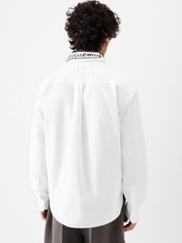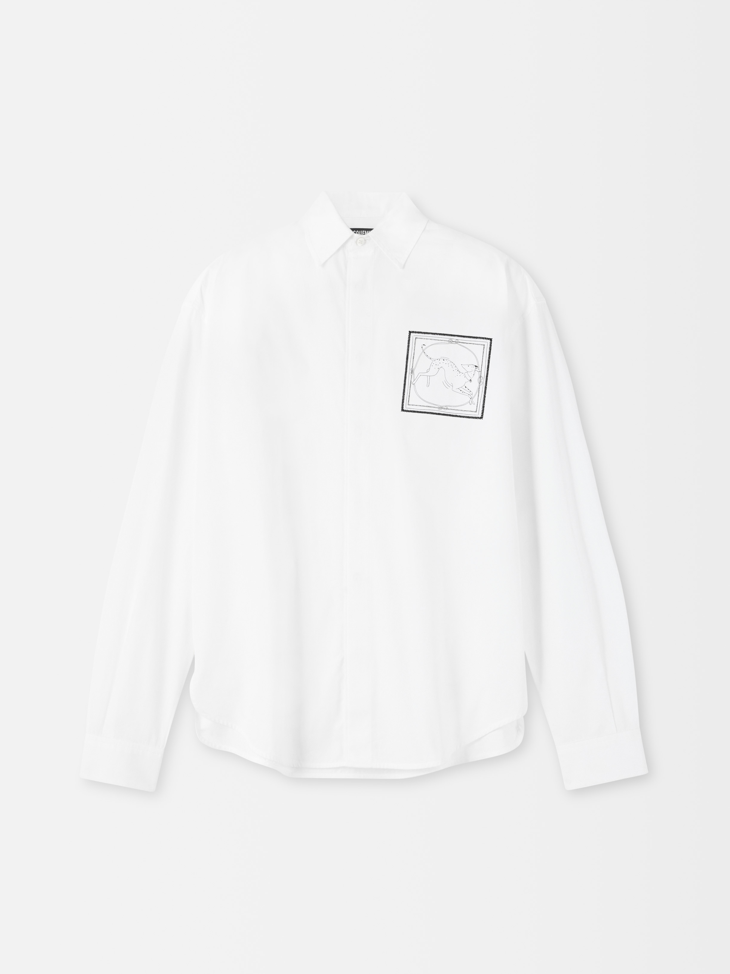 Dog patch shirt - Straight fit - Cotton poplin - Embroidered patch with Dog print - Pointed collar - Embroidered logo on the collar - Hidden button placket - Square cuffs with hidden buttons - Embroidered 50’s logo on the front - “J" loop on the the back - Back yoke - Rounded pleat in the back - Mother-of-pearl buttons The model is 188cm and wears a size 48 100% Cotton Made in France Ref. SHM00541AW002081KU
