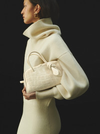 Small soft bowling bag - Bowling bag in crocodile-embossed suede - Double-sided zipper - Tubular handles in matching leather - Knotted detail on handle - Removable cross-body strap - Embossed logo - Interior pocket - Length: 26cm - Height: 16cm - Width: 11cm Each leather is unique and has been carefully selected by our team. To maintain the original condition of this item, we recommend to avoid direct and over-exposure to light and contact with cosmetics, water or heat. We advise to store this item into the dust bag in a dry place. 100% Calf Leather / Lining: 100% Cotton Made in Italy Ref. BAW00416AC07A09120