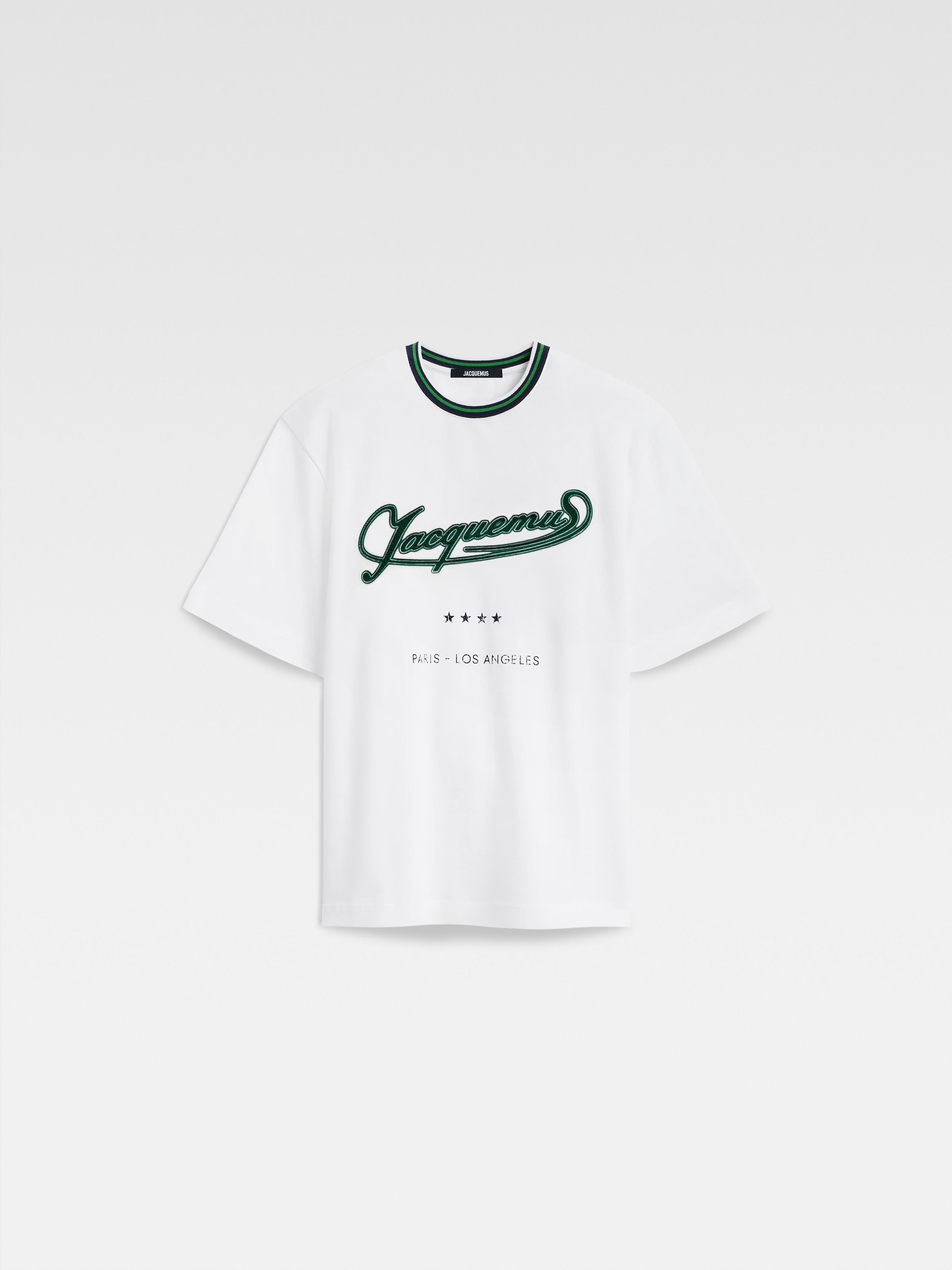 Short-sleeved logo t-shirt - sold exclusively online and in our Los Angeles store - Relaxed fit - Logo loop embroidery on front - Dumbbell print on back collar - Contrasting rib collar - Exclusive model designed for the opening of the JACQUEMUS store in Los Angeles Men : The model is 187cm and wears a size M Women : The model is 175cm and wears a size S 100% Cotton Made in Portugal Ref. TSM00406AJ002261JZ