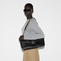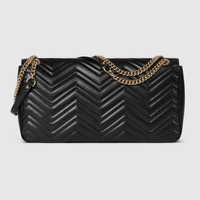 Black matelasse chevron leather - Light gold toned hardware - Gucci Rosso Ancora leather lining - Double G - Inside: 1 zip pocket - Sliding chain strap can be worn as a shoulder strap with 21.6" drop or can be worn as a top handle with 13" drop. - Weight: 2lbs, approximately - size: 15.7" x 8.3" x 3.3" 788371O comes with dust bag, booklet All sales are final. We only accept returns if there is a quality issue.