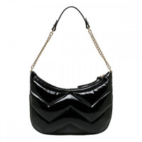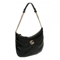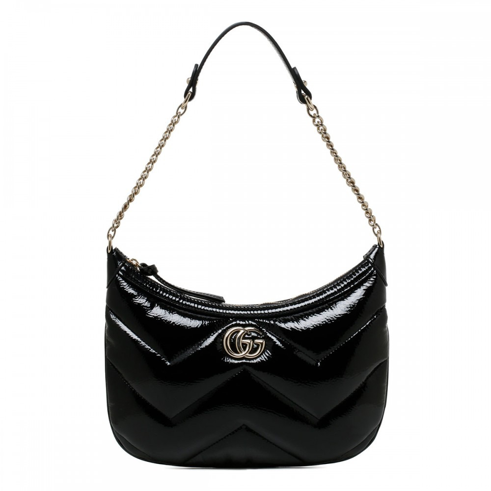 777263O Size 9 - 6 - 1” Black quilted chevron patent leather GG Marmont small shoulder bag from Gucci featuring light gold-toned double G and hardware, shoulder strap, zip fastening along top, black microfiber lining and one internal open pocket. Comes with dust bag, booklet All sales are final. We only accept returns if there is a quality issue.