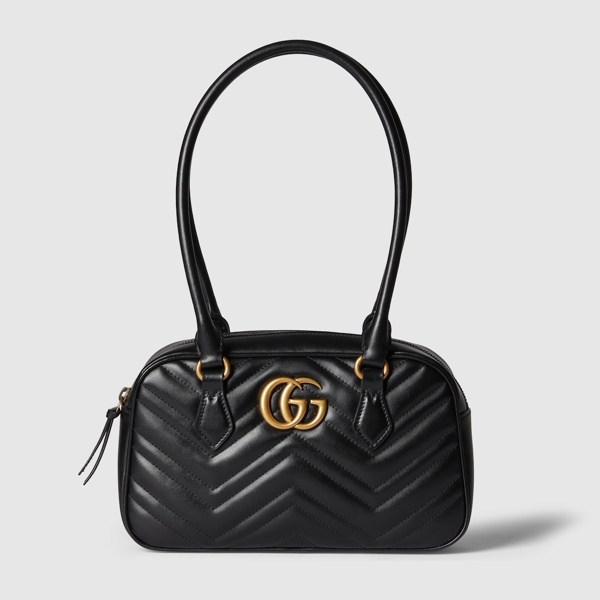 Black matelasse chevron leather - Gold-toned hardware - Brown microfiber lining with a suede-like finish - Double G - Inside: 1 open pocket - Handle drop: 8.6" - Zip closure - Weight: 15.8 oz approximately - Small: 10" W x 6" H x 2.5" D. 795199O Comes with dust bag, booklet All sales are final. We only accept returns if there is a quality issue.